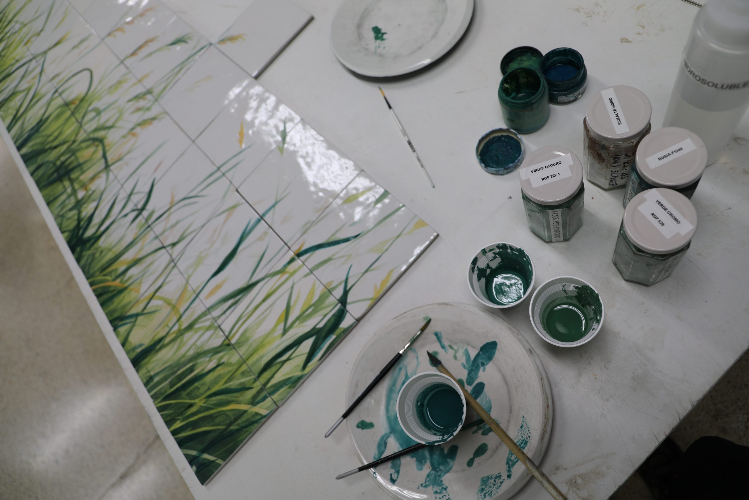 El espacio consta de dos murales cerámicos (una mujer y una zona de plantas) diseñados por artistas del Atelier, que para realizarlos han introducido bocetos en un software de inteligencia artificial para generar diferentes alternativas y mediante postproducción en Photoshop se ha llegado al boceto final. Estos murales cerámicos se han plasmado mediante calcas y pintura vitrificable a alta temperatura.