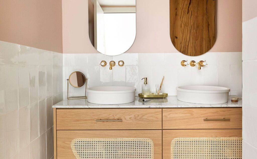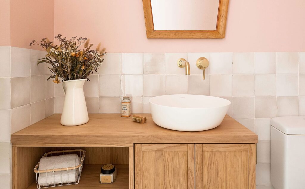 Las baldosas porcelánicas acaban de dar personalidad a la estancia y las paredes en rosa crepe y el alicatado vintage aportan luminosidad.