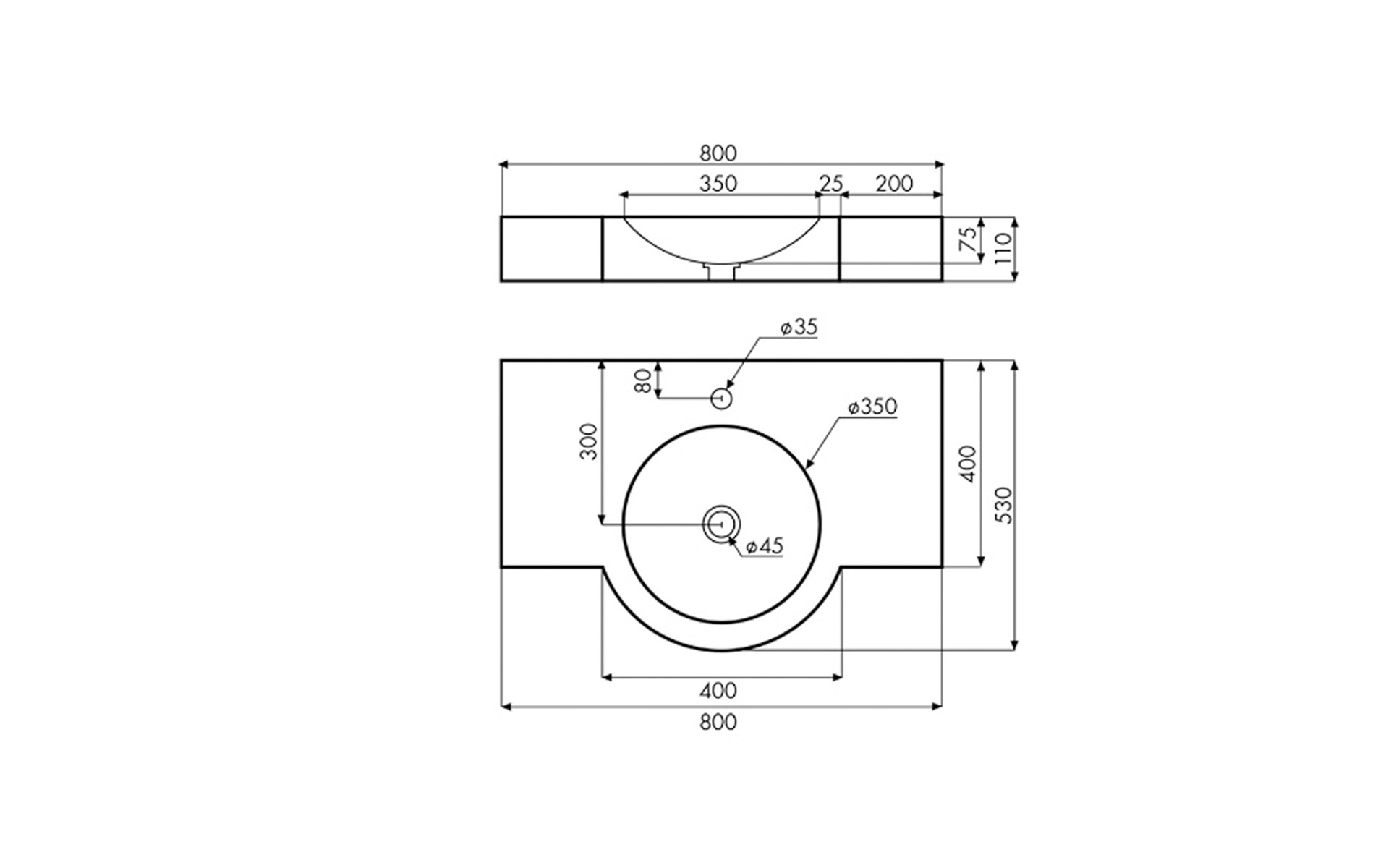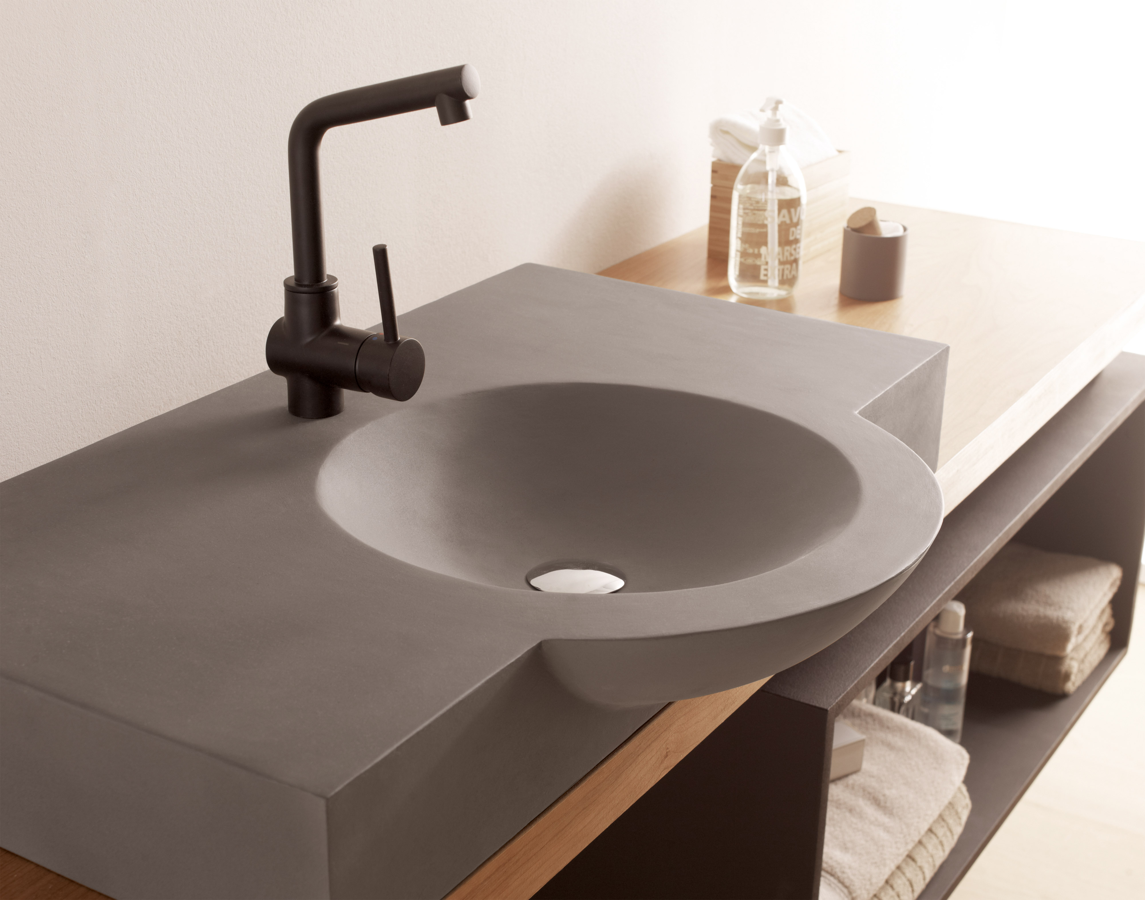 La materialidad del cemento en un formato amplio de sobre encimera. Un lavabo de trazo recto y lenguaje urbano que suma autenticidad al baño.