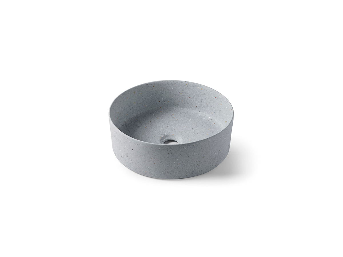A hand-painted artisan piece that reinterprets the texture of trachyte stone. The circular porcelain countertop design adds warmth and character.