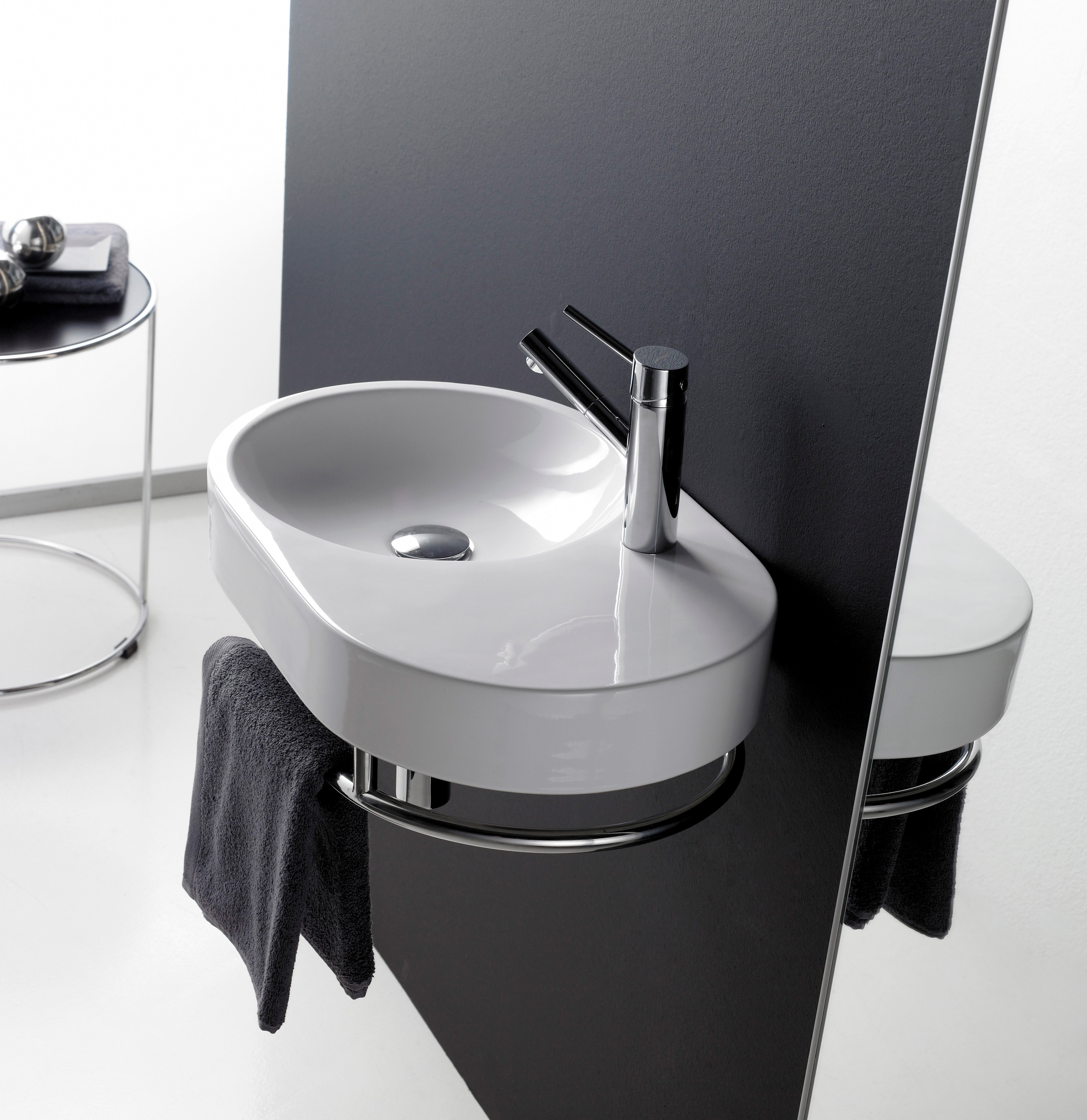 Un diseño ovalado en porcelana brillo, de instalación sobre encimera. Sus líneas suaves aportan sobriedad y un aire mediterráneo al baño.