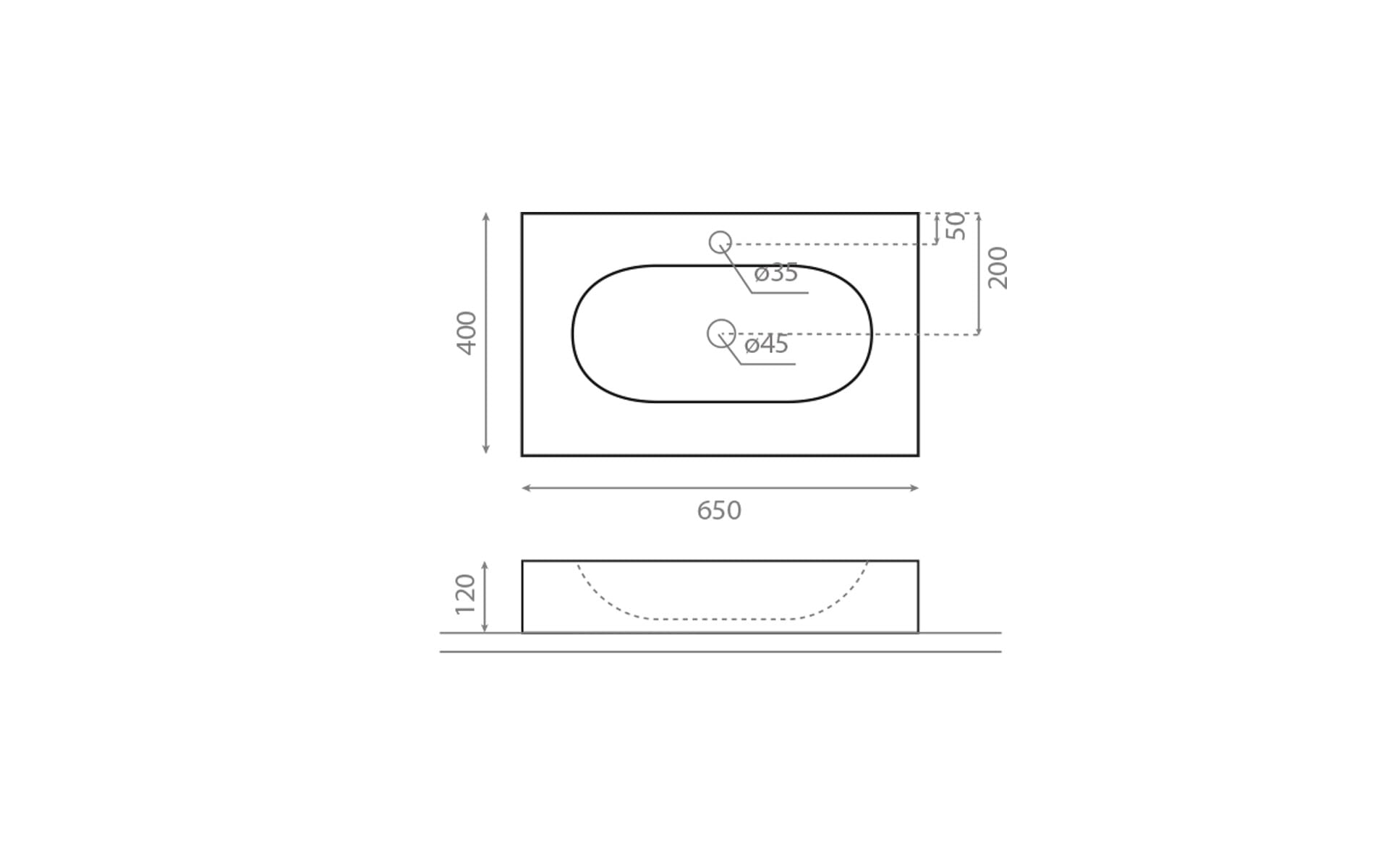 Rectangular format in gloss porcelain, with suspended or countertop installation. Its clean design with overflow provides versatility.