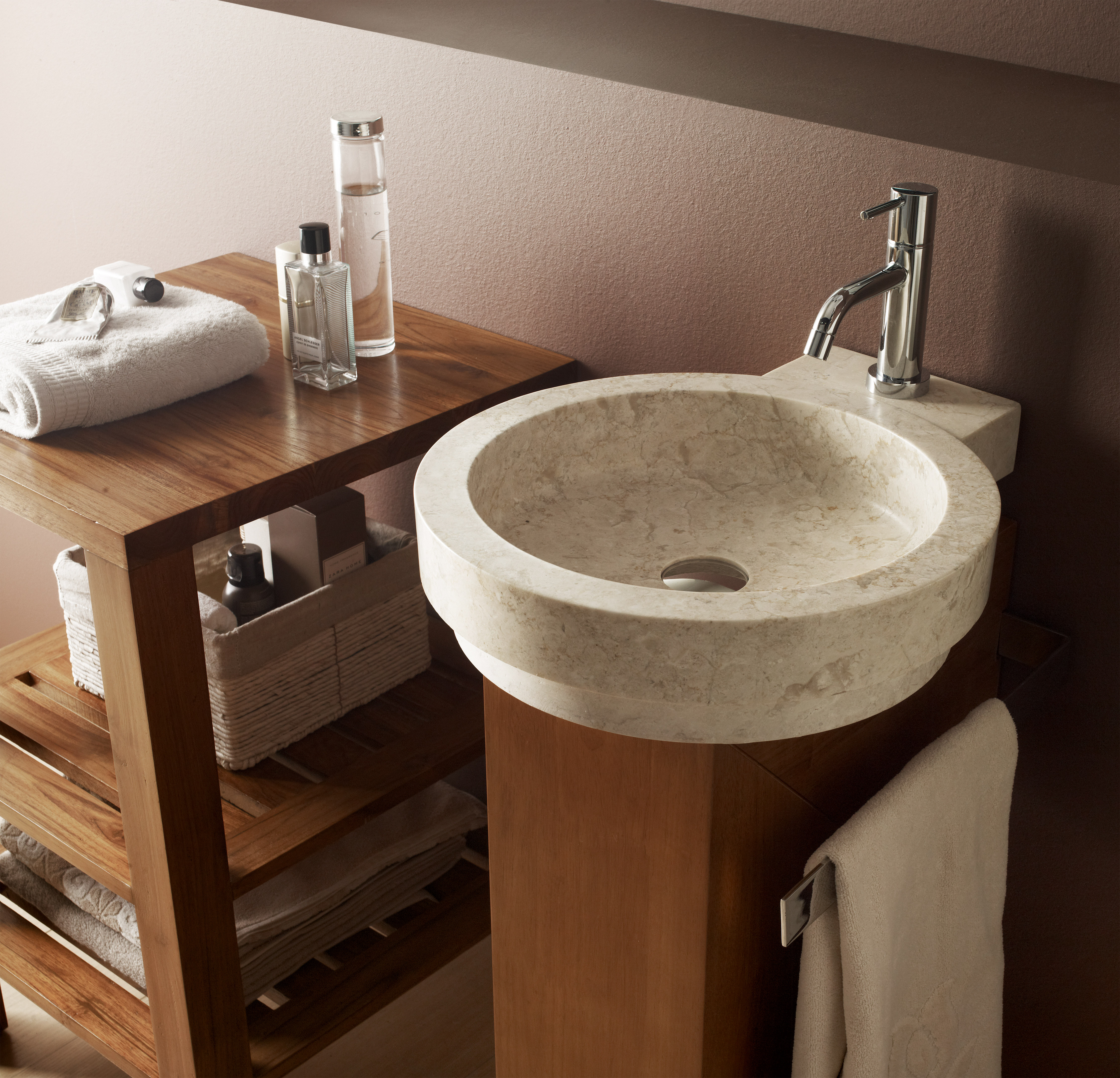 Lavabo circular en piedra natural, disponible en tonos negro o beige. Una pieza de sobre encimera que realza la fuerza del material en su estado más puro.