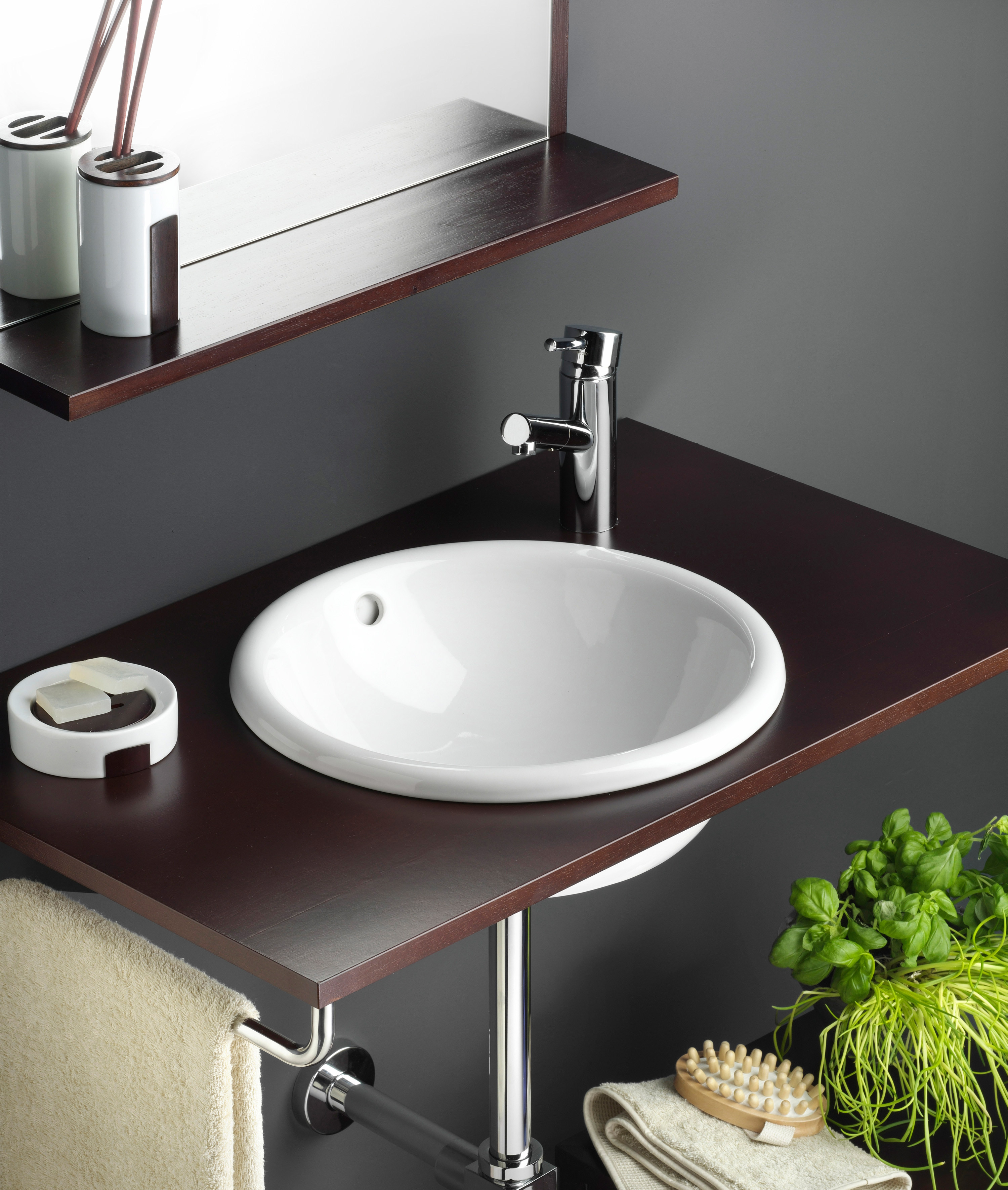 Lavabo circular de semiencastre en porcelana blanca. Con rebosadero integrado, combina sobriedad con funcionalidad.
