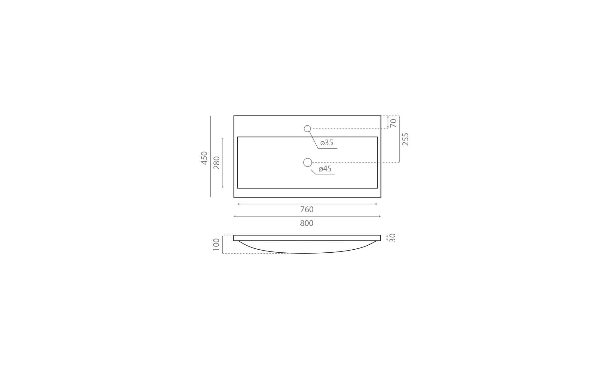 Lavabo rectangular en resina blanca, de instalación sobre mueble. Disponible en varios tamaños, sin rebosadero, aporta ligereza y practicidad.