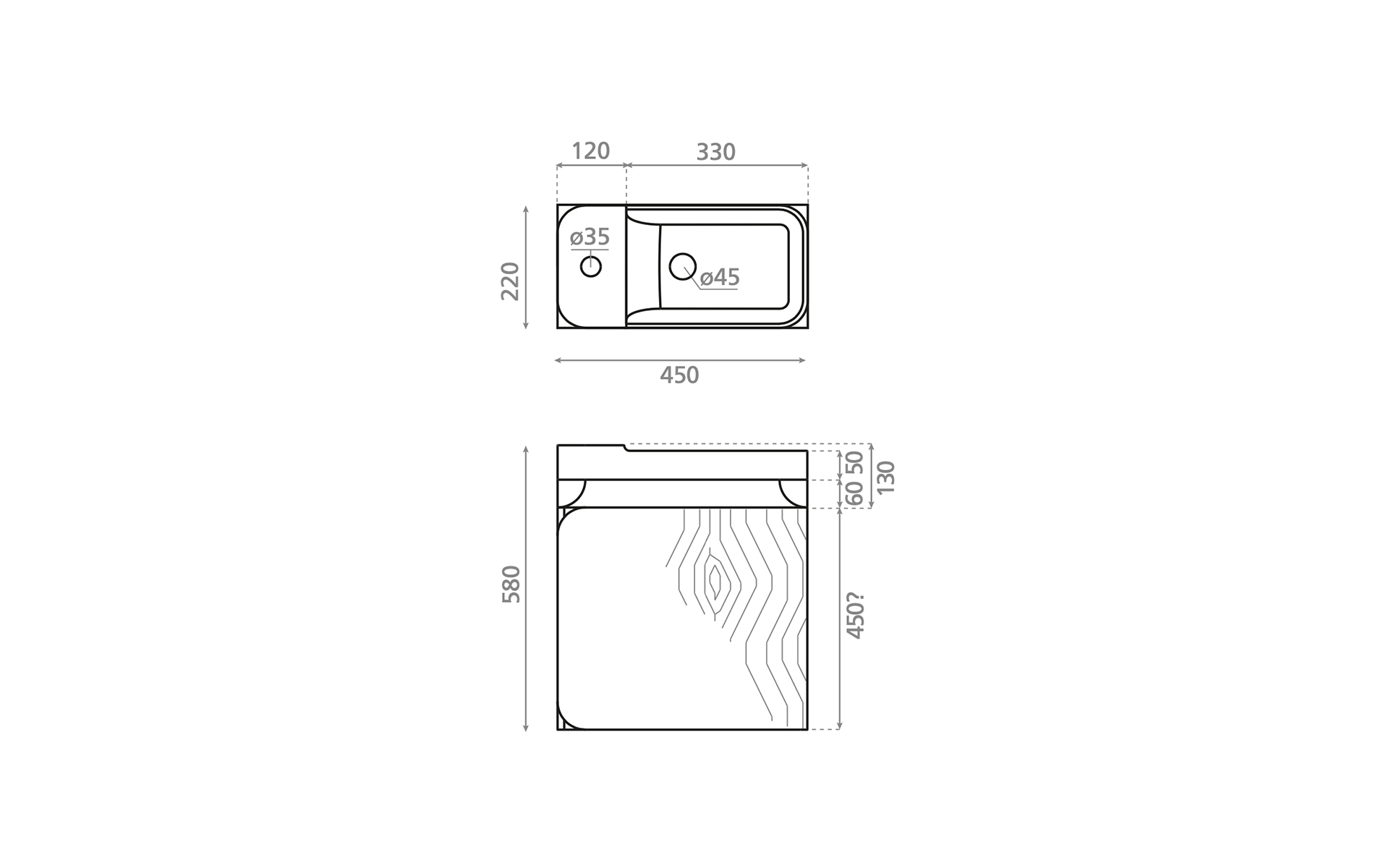 Conjunto que combina lavabo rectangular en solid surface con estructura en bambú. Una propuesta cálida y resistente.