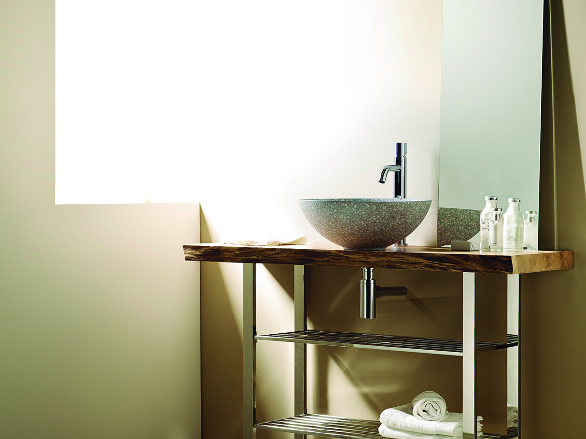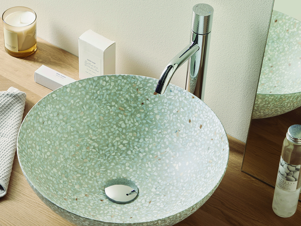 Circular porcelain sink decorated with a motif inspired by the texture of quartz. A sober design in gray tones that adds mineral character to the space.