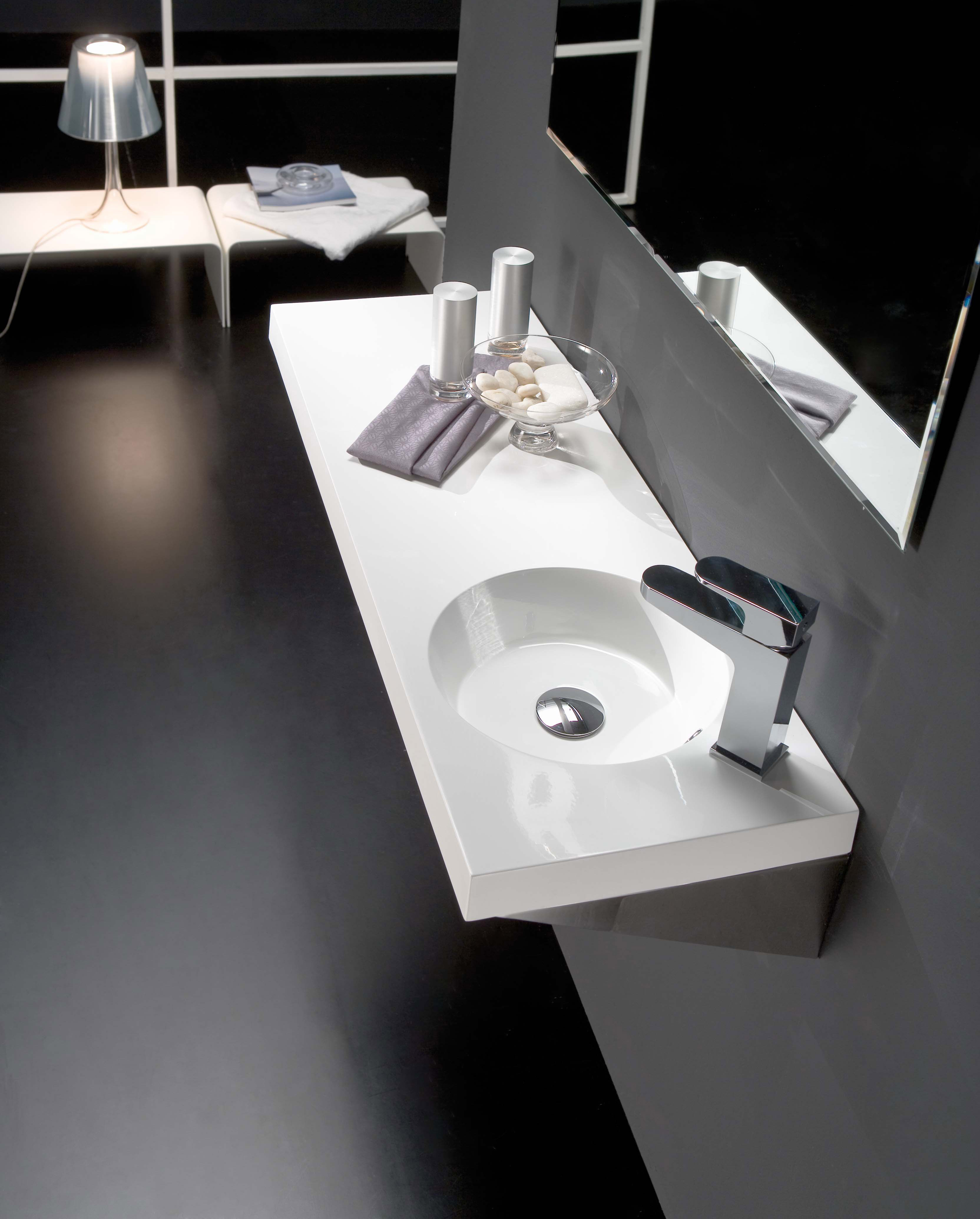 Encimera de resina con seno integrado. Su diseño minimalista y la suavidad del material permiten integrarla con facilidad en diferentes estilos de baño.