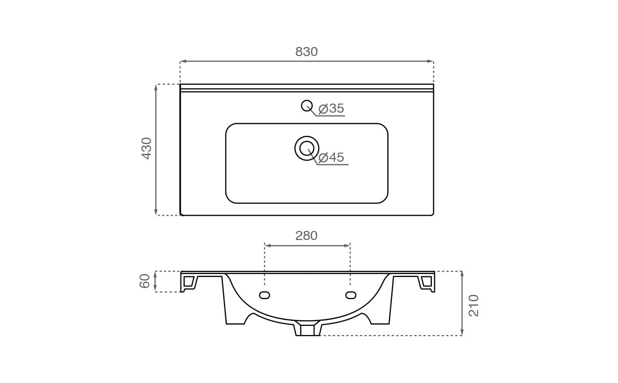 Lavabo rectangular suspendido en porcelana blanca brillo, disponible en dos tamaños. Una solución elegante y práctica, adecuada para baños de líneas modernas.
