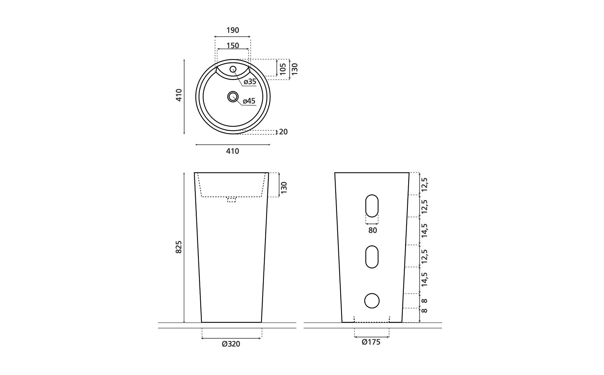 Porcelain washbasins decorated with motifs in shades of gray. The series is presented in different formats, including the pedestal version, providing visual continuity with a graphic and sober character.