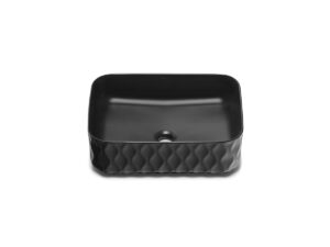 Countertop basin in matt porcelain, available in white or black. Its wave relief adds texture and a contemporary character to the surface.