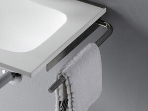 Soporte mural de acero inoxidable con toallero incorporado. Una opción práctica para espacios compactos.
