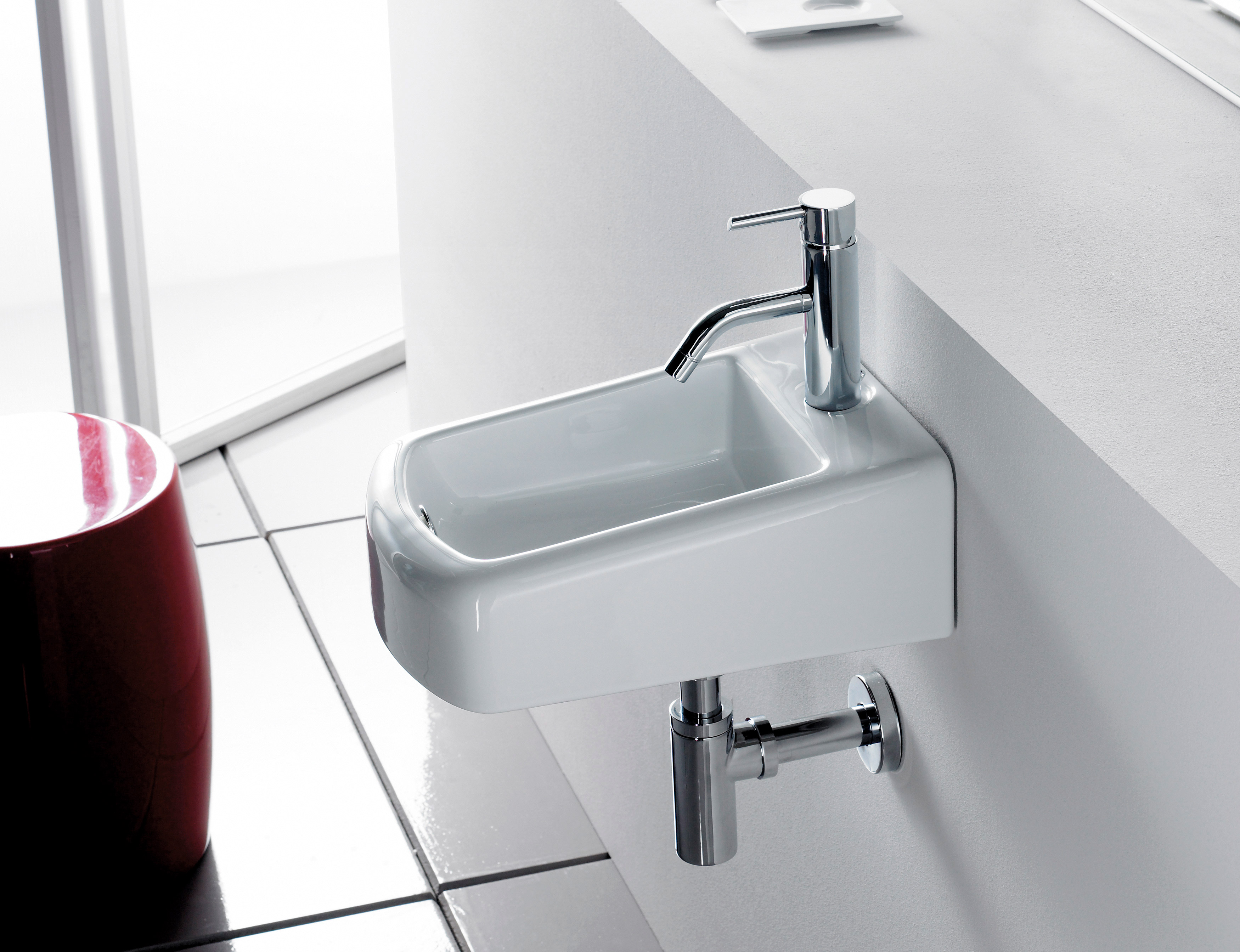 Lavabo mini suspendido en porcelana blanca brillo, con rebosadero. Un diseño compacto ideal para baños pequeños.