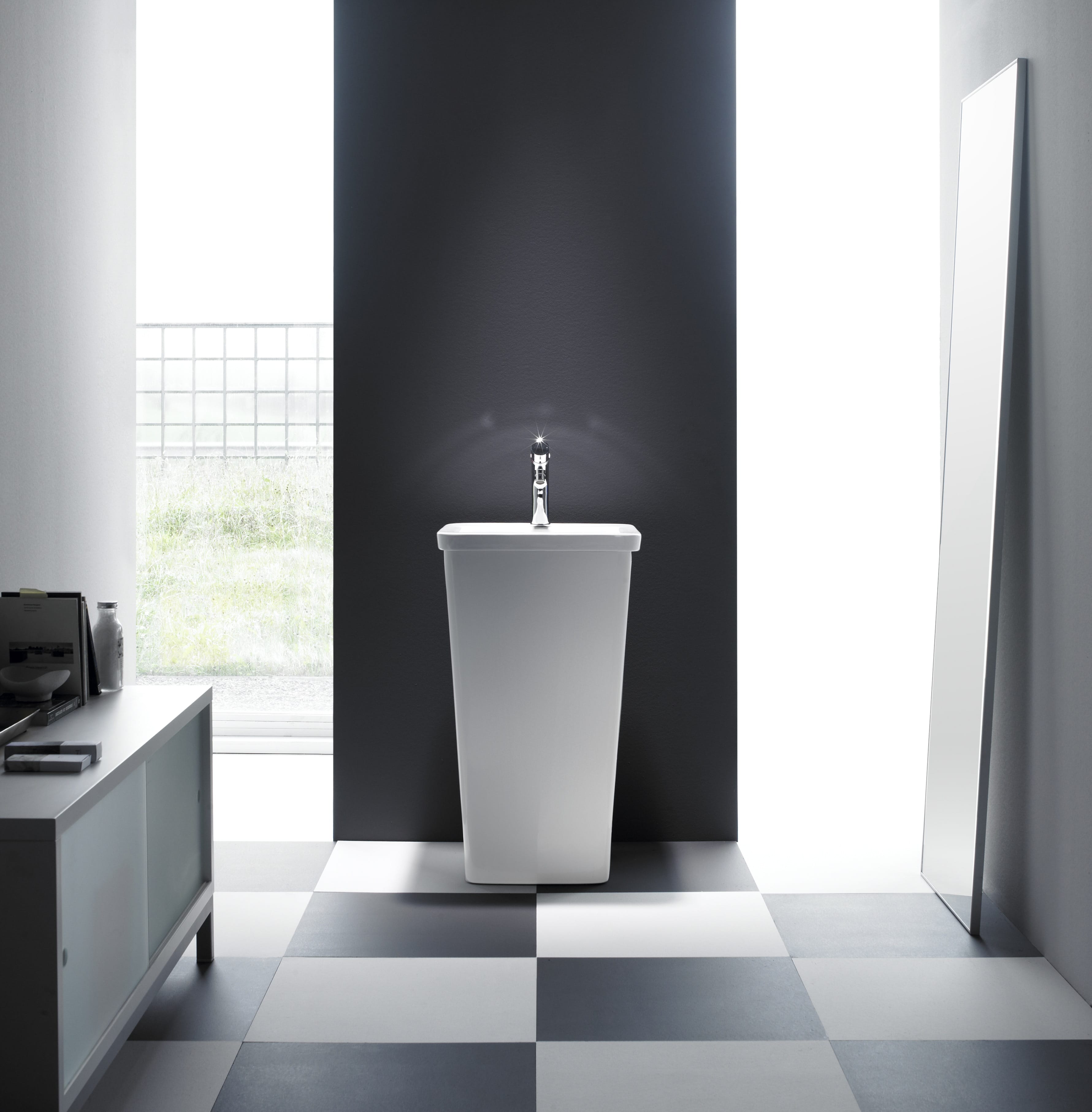 Lavabo pedestal de porcelana blanca con líneas clásicas y proporciones equilibradas. Una pieza que une tradición y funcionalidad, aportando presencia sólida en el espacio de baño.