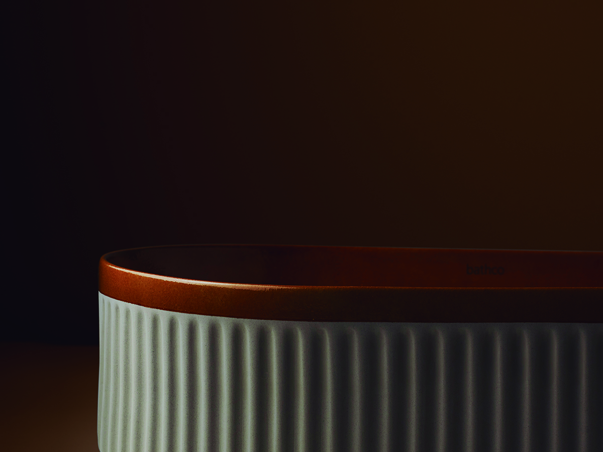 Hand-finished in bright orange on oval format. A washbasin full of energy and originality.