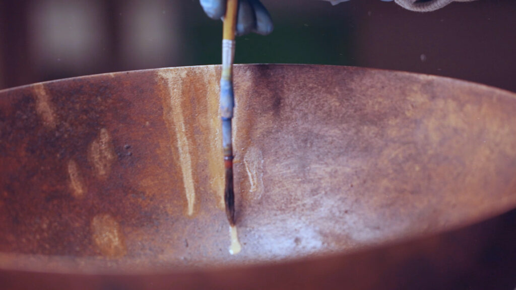 En la primera fase los artistas del Atelier aplican pigmento vitrificable de color anaranjado como base. Después se aplica tierra natural recogida directamente en Cantabria para conseguir ese efecto oxidado tan característico del Acero Corten. En concreto se aplica tierra con alto contenido en hierro lo que ayuda a dar ese aspecto rojizo al lavabo.