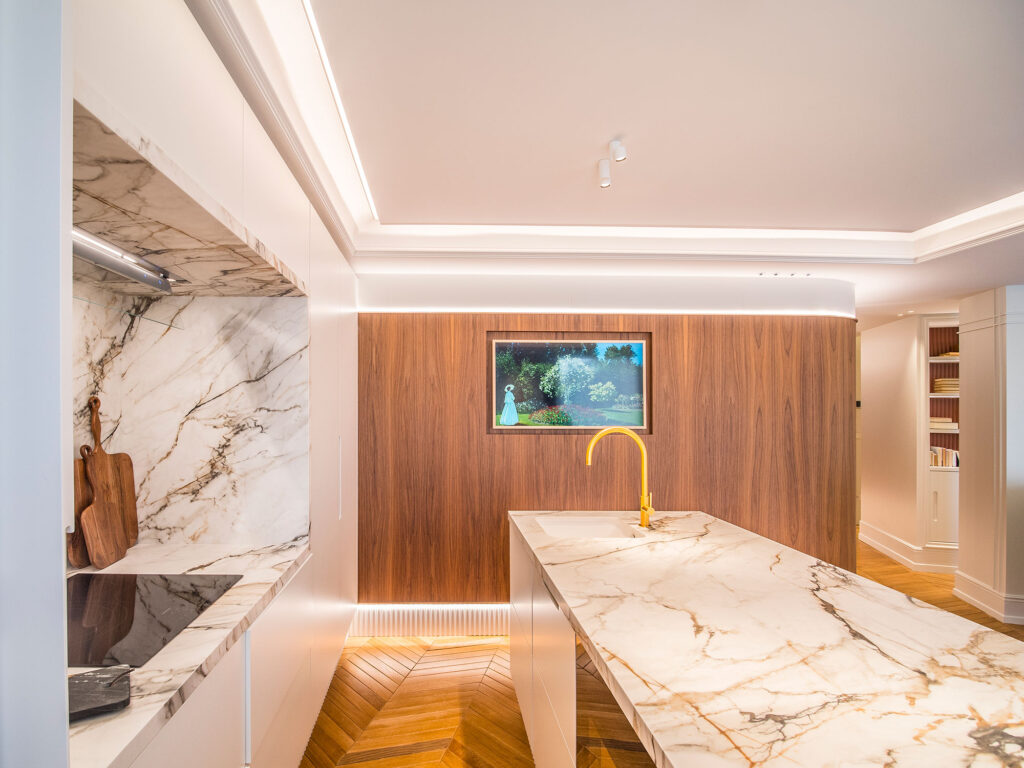La cocina se integra con elegancia en el salón comedor gracias a mobiliario en blanco sin tiradores y a una isla de un porcelánico efecto mármol natural con vetas marrones. La grifería dorada aporta la elegancia necesaria.