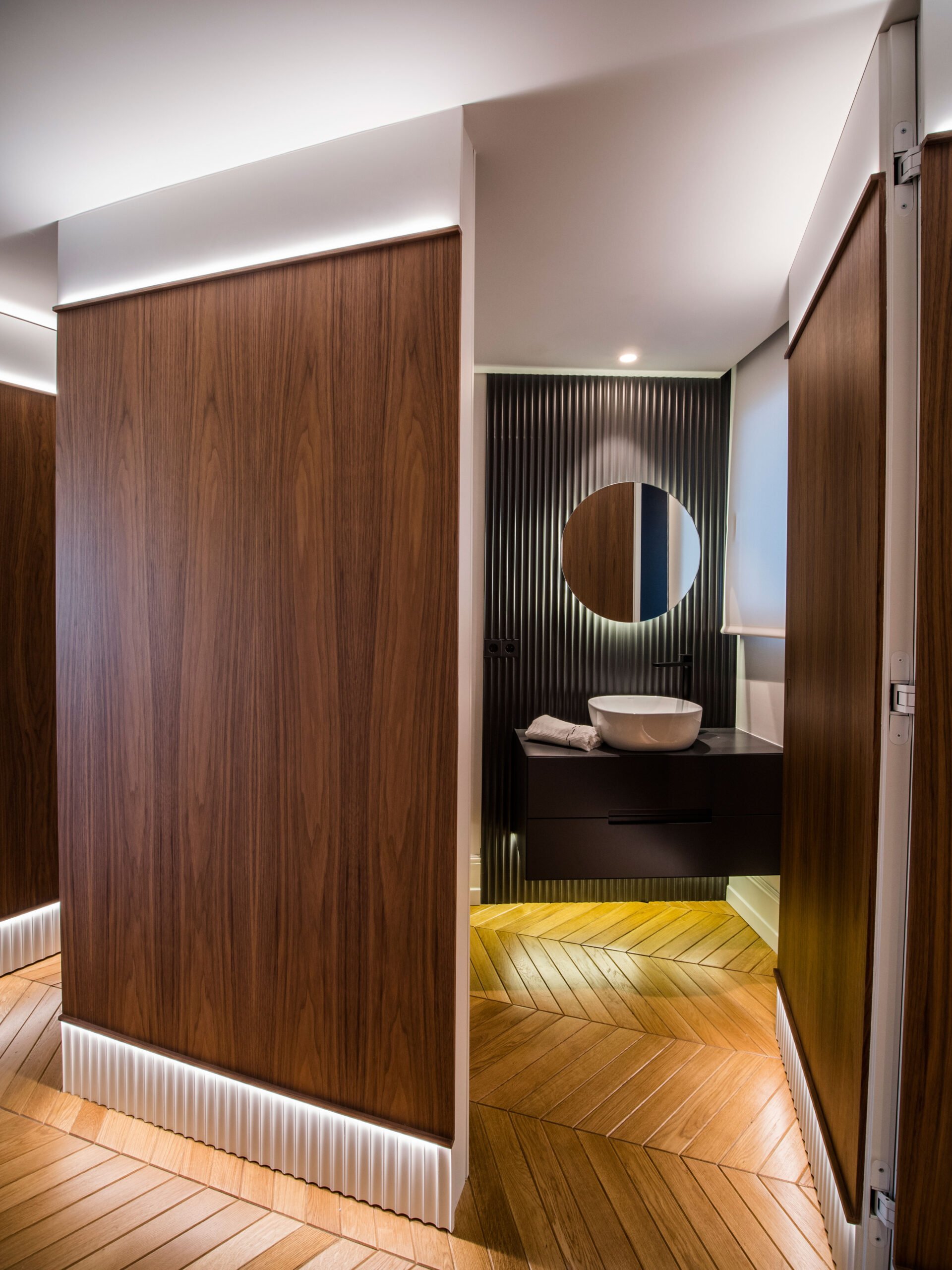 El trabajo de interiorismo se centró en algunos elementos clave utilizados en todas las estancias: madera noble, iluminación indirecta y molduras.