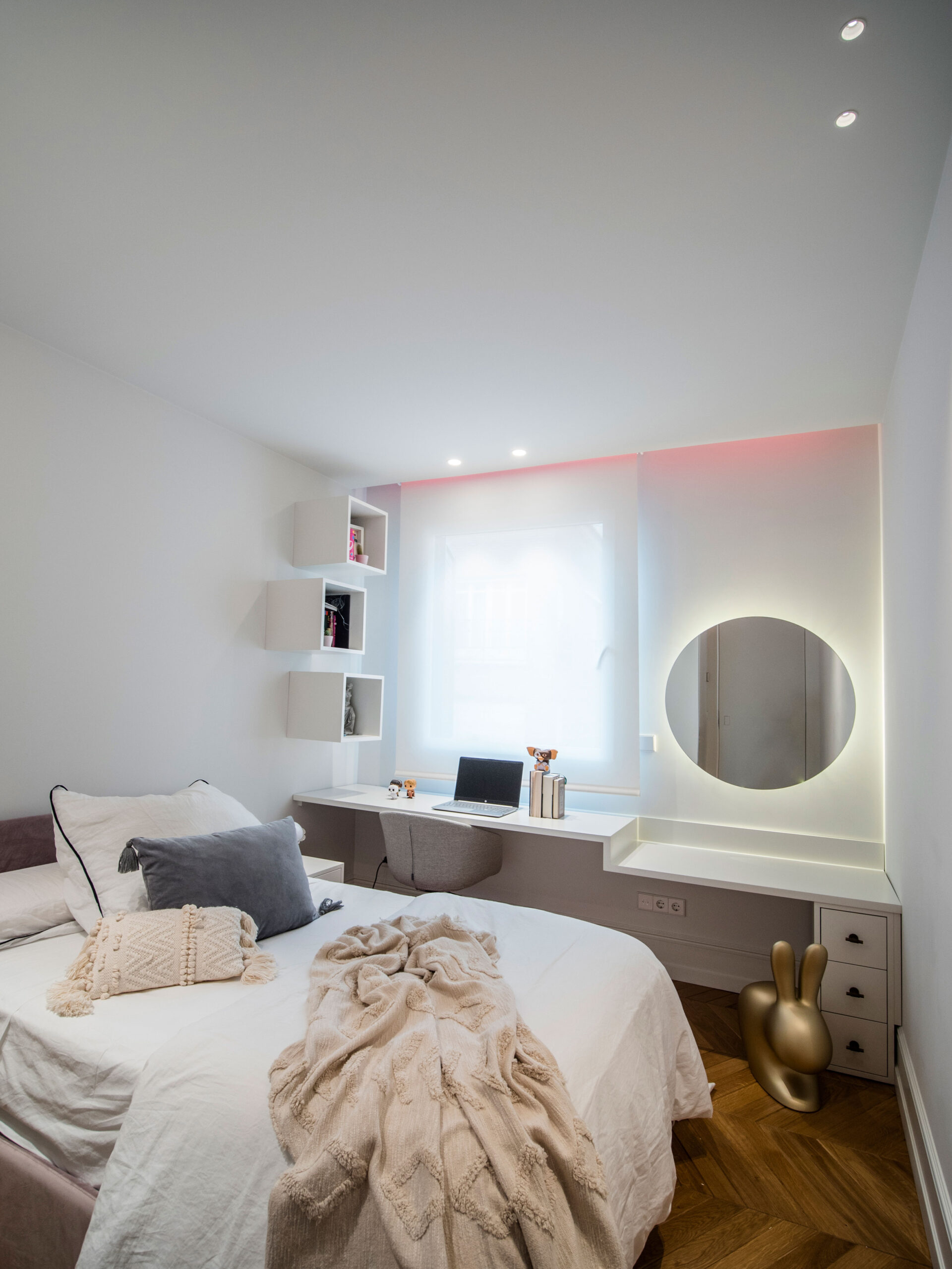 Las otras dos habitaciones, más juveniles, se han resuelto con mobiliario realizado a medida, tanto los armarios que quedan discretamente escondidos como los escritorios que van de pared a pared.