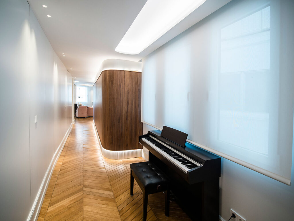 Una de las paredes continúa hasta la zona de día en madera contrachapada. En esta pared el rodapié es alto y está realizado con molduras en 3D iluminadas en su blanco original, lo que aporta mayor luminosidad. La otra pared del pasillo es blanca y esconde algunos armarios para almacenaje. Frente a la ventana se ha dispuesto el piano, aquí una parte del techo se ha foseado a modo de gran luminaria.