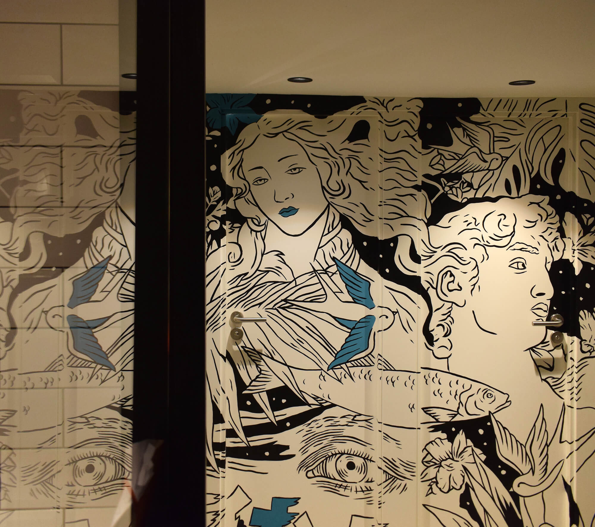 En la imagen de las puertas se jugó con dos iconos de la historia del arte como describe el artista “son el David de Miguel Ángel y la Venus deBotticelli para diferenciar el baño femenino del masculino. Estas dos figuras se han rodeado de elementos escogidos para generar una estampa onírica y abierta a la interpretación como la propia cocina de autor”.