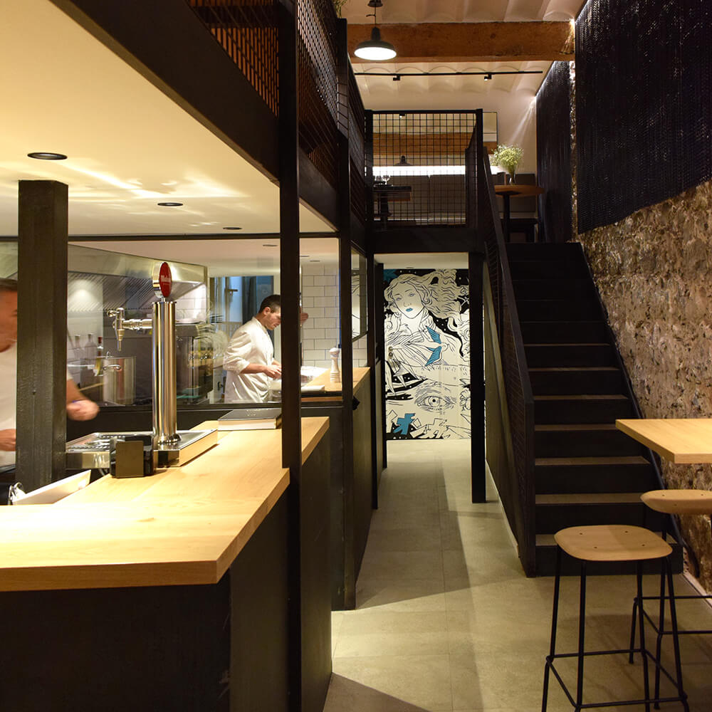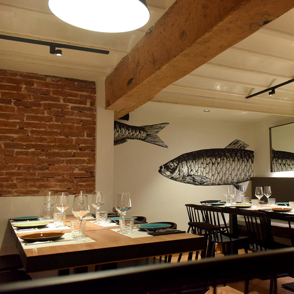 Las otras dos intervenciones se encuentran en el comedor superior, un espacio reservado a los elementos gastronómicos como las verduras y el pescado. Sardinas en la pared principal y alcachofas, tomates y cebollas en otro de los rincones, acompañando a los comensales. Estos fueron elegidos como sugerencia del propio chef, Nacho del Corral, continuando con el diseño gráfico aplicado en las cartas del restaurante.