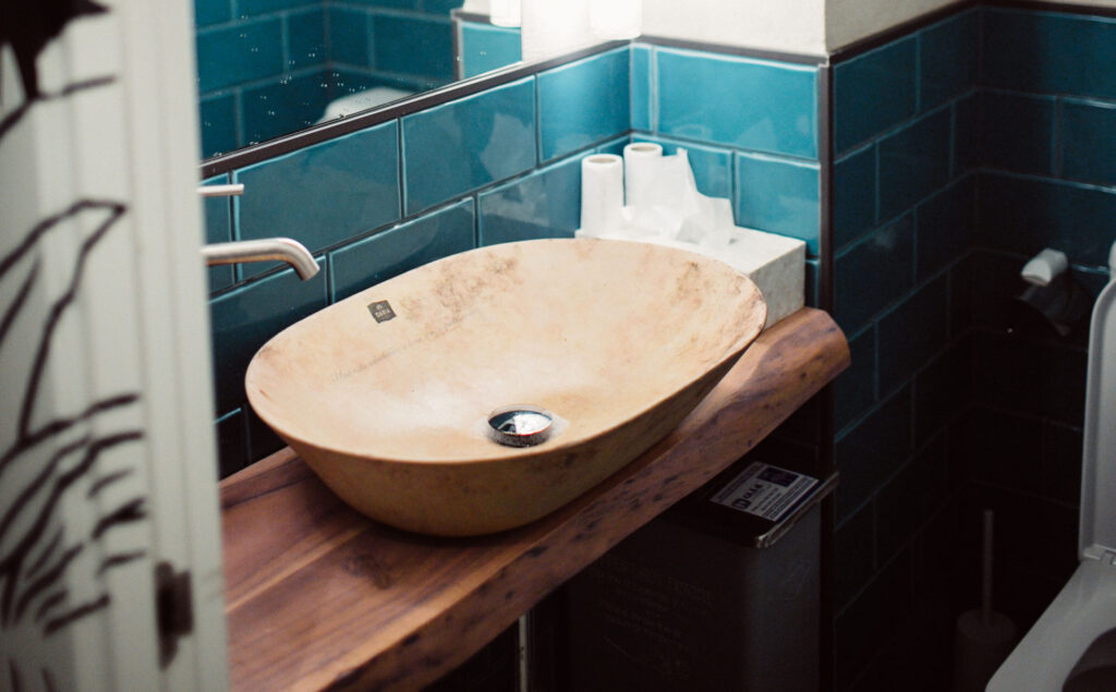 En el baño femenino se puede encontrar un lavabo New Toulouse de porcelana cruda de microcemento rosa mientras que en el masculino se instaló un lavabo Lys crudo de microcemento gris realizados en eltaller de Bathco. Los artistas de Bathco Atelier aplicaron el logo del restaurante gracias a calcas cerámicas y decoraron la pieza con frases que hacen referencia al placer de la gastronomía.Tanto el New Toulouse como el Lys se colocaron sobre encimeras de madera maciza en decapé realizadas a medida por carpinteros cántabros.