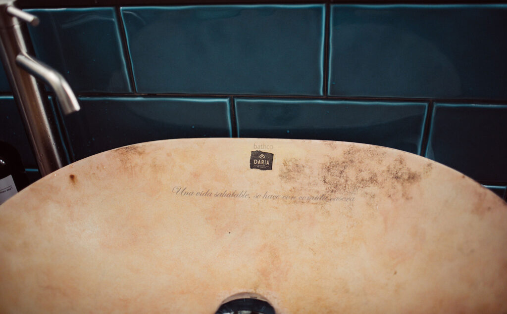 La intervención de Bathco Atelier en el restaurante DARIA consta de tres piezas murales, dos piezas cerámicas y dos lavabos decorados.