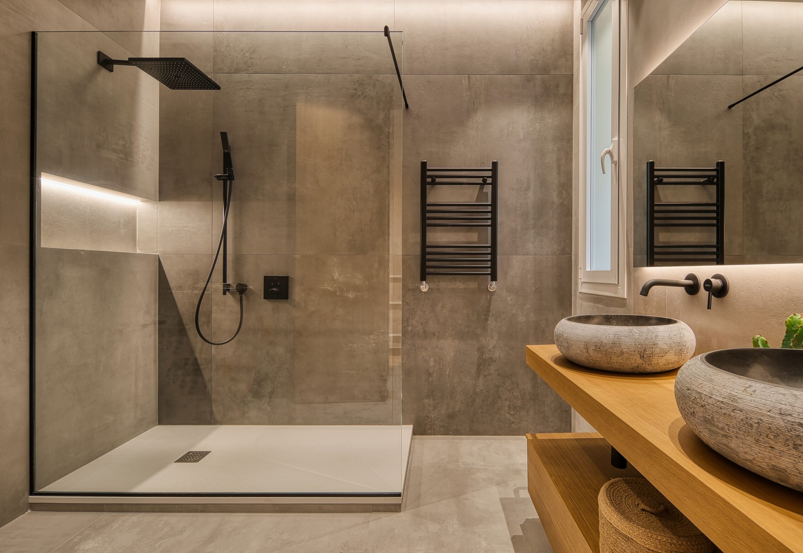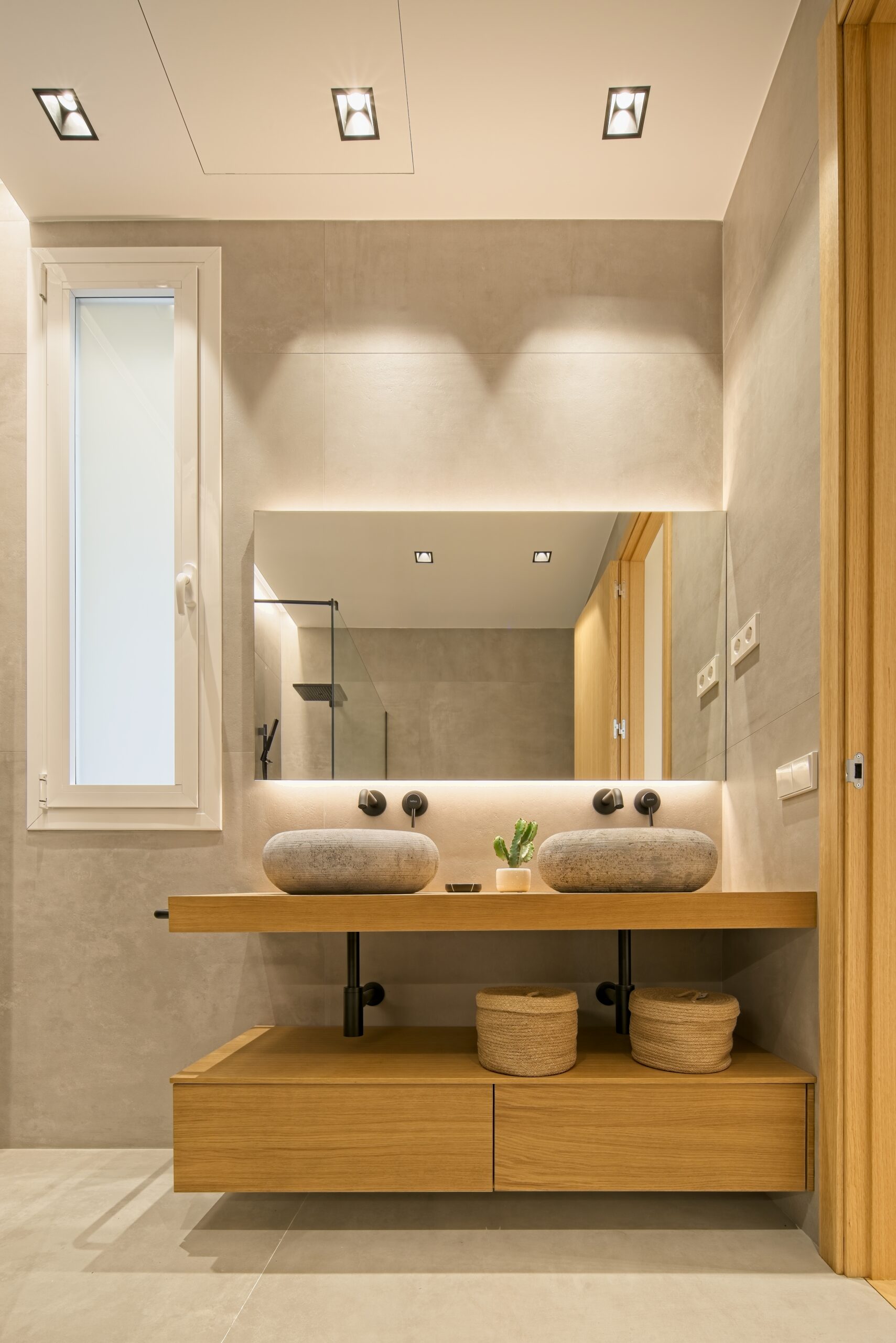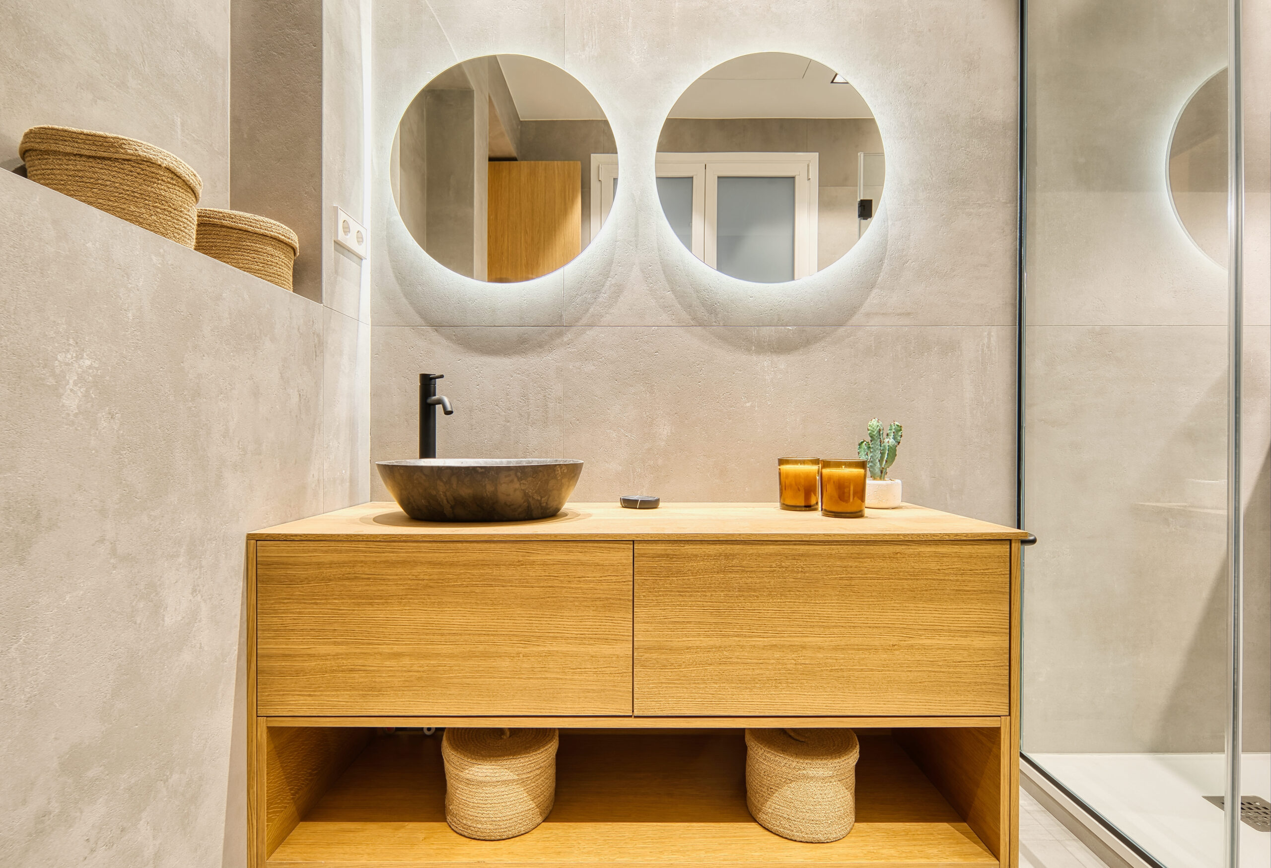 El diseño respira gracias a la cuidadosa elección de materiales. La nobleza de la madera se entrelaza con porcelánicos de gran formato, logrando una fusión de lo clásico y lo industrializado. Molduras en techos y paredes añaden una dimensión clásica, mientras que la decoración minimalista mantiene la elegancia sin excesos.