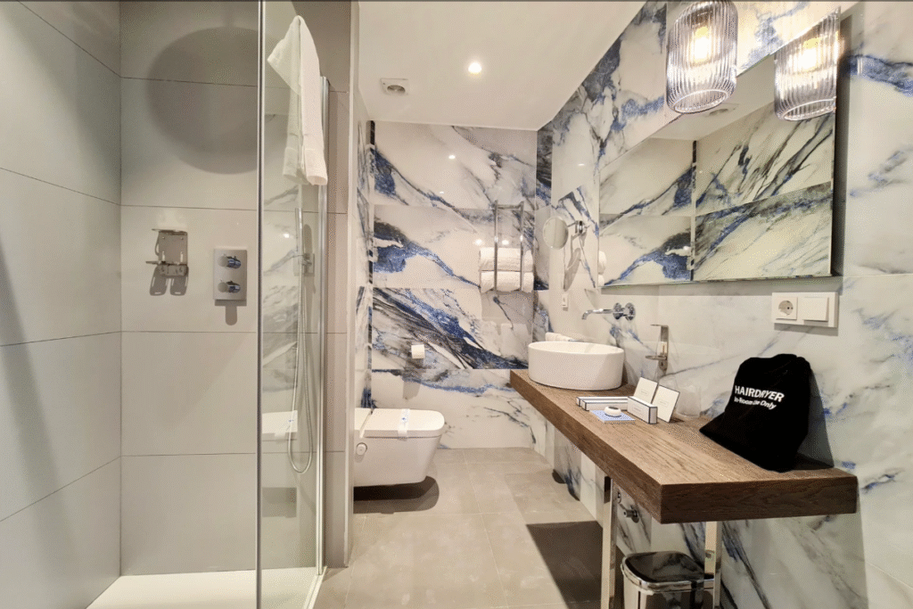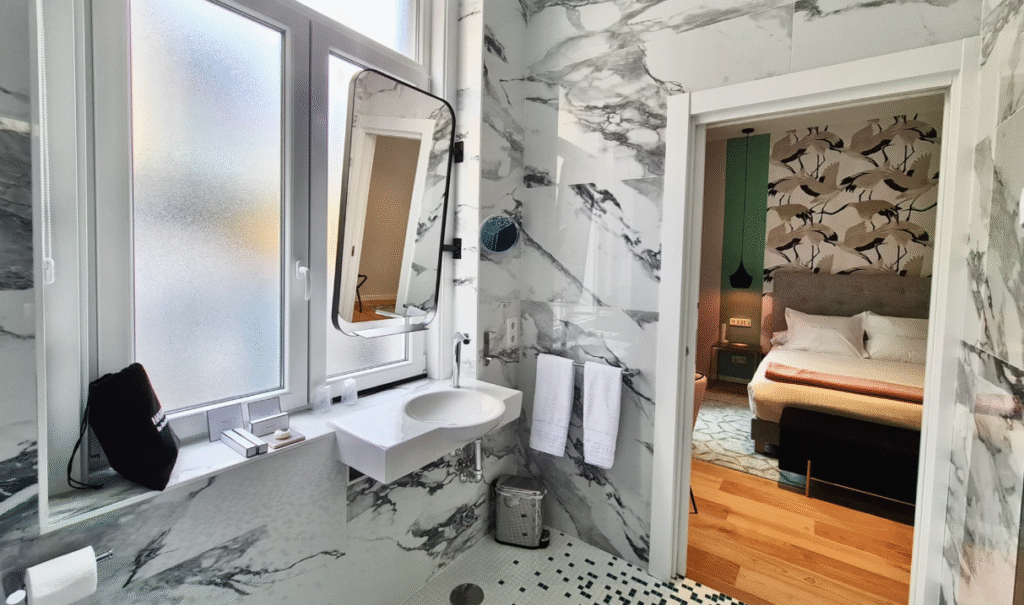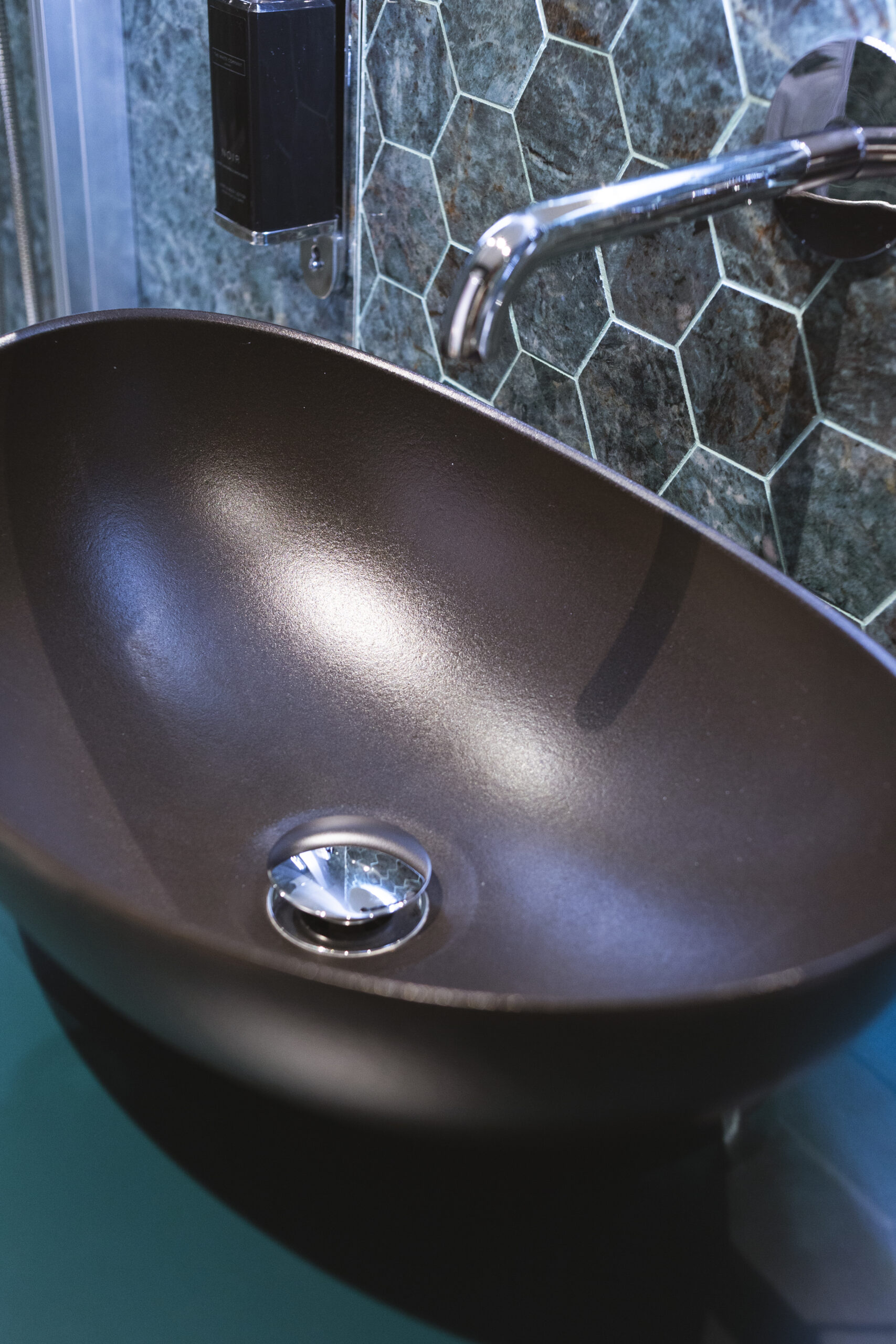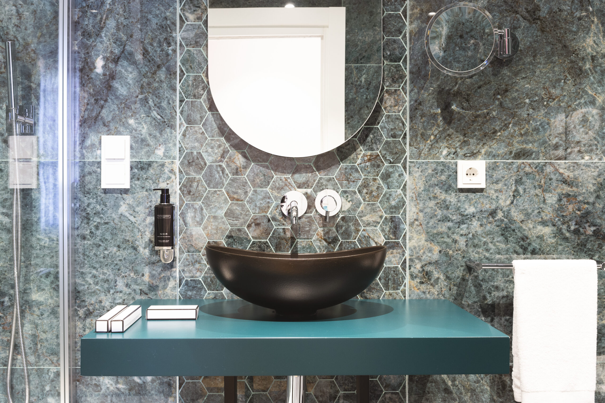 Si nos adentramos en los baños de las habitaciones veremos espacios únicos, cuidados, originales… y es que la selección de los materiales no fue casual. Cada una de las piezas fue escogida por la idiseñadora de forma meditada para crear ambientes con sentido y en este proceso fue fundamental el asesoramiento Andrés Navedo, responsable de exposiciones en Lostal, uno de los distribuidores oficiales de Bathco en Cantabria.