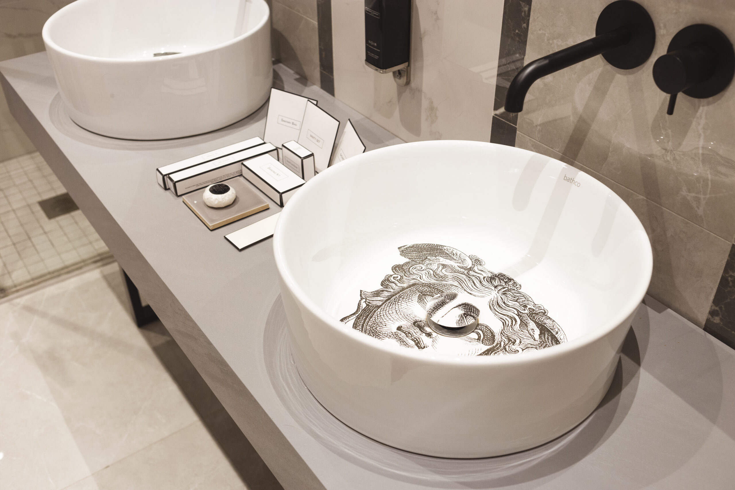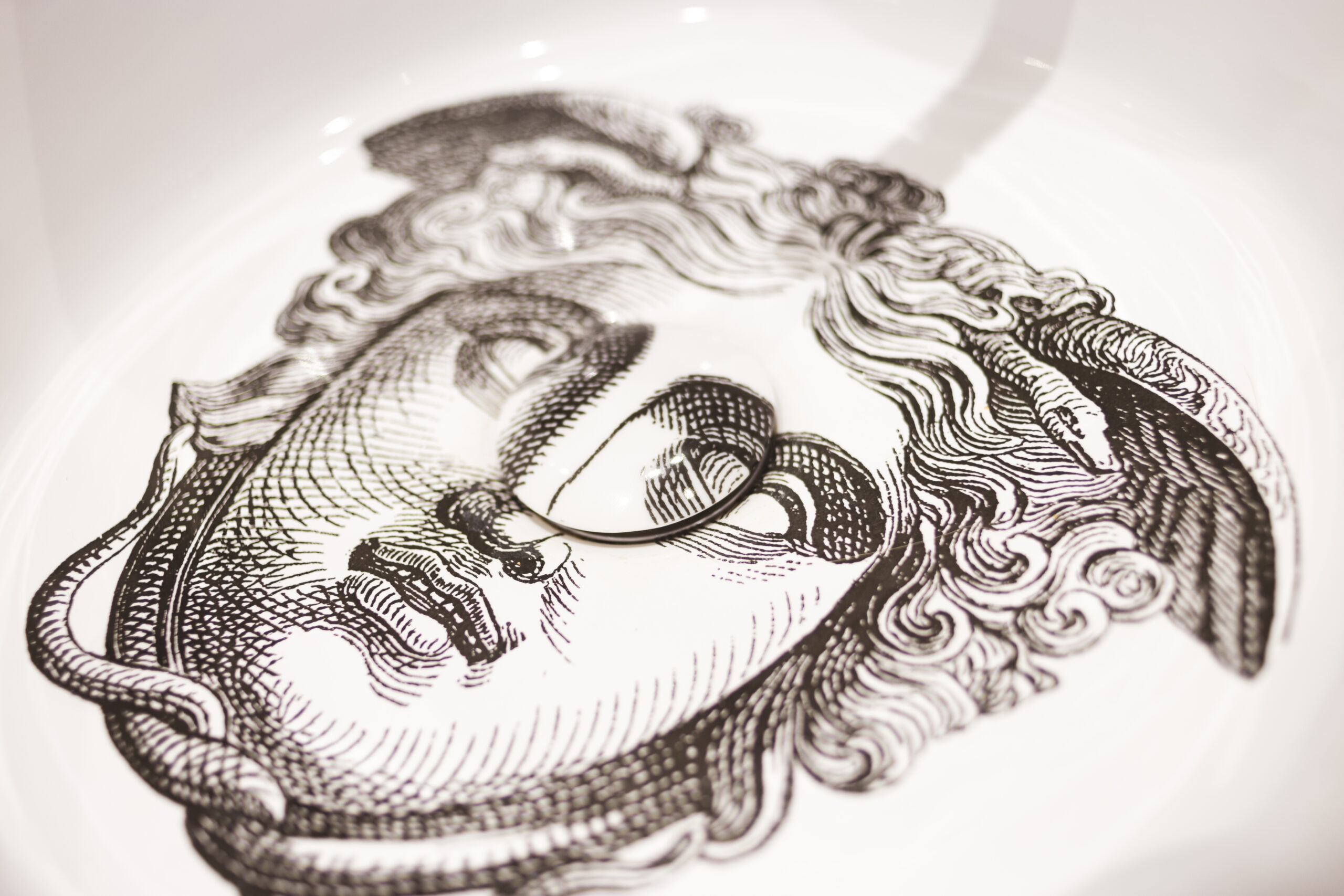 En este caso, la diseñadora quería que se representase el medallón de Hermes (Mercurio). Para ello, se hizo un diseño en formato digital, se imprimió en calcas cerámicas y se decoró haciendo coincidir el dibujo del lavabo con el de la válvula. De esta manera el visitante apreciará el dibujo completo durante el aseo.