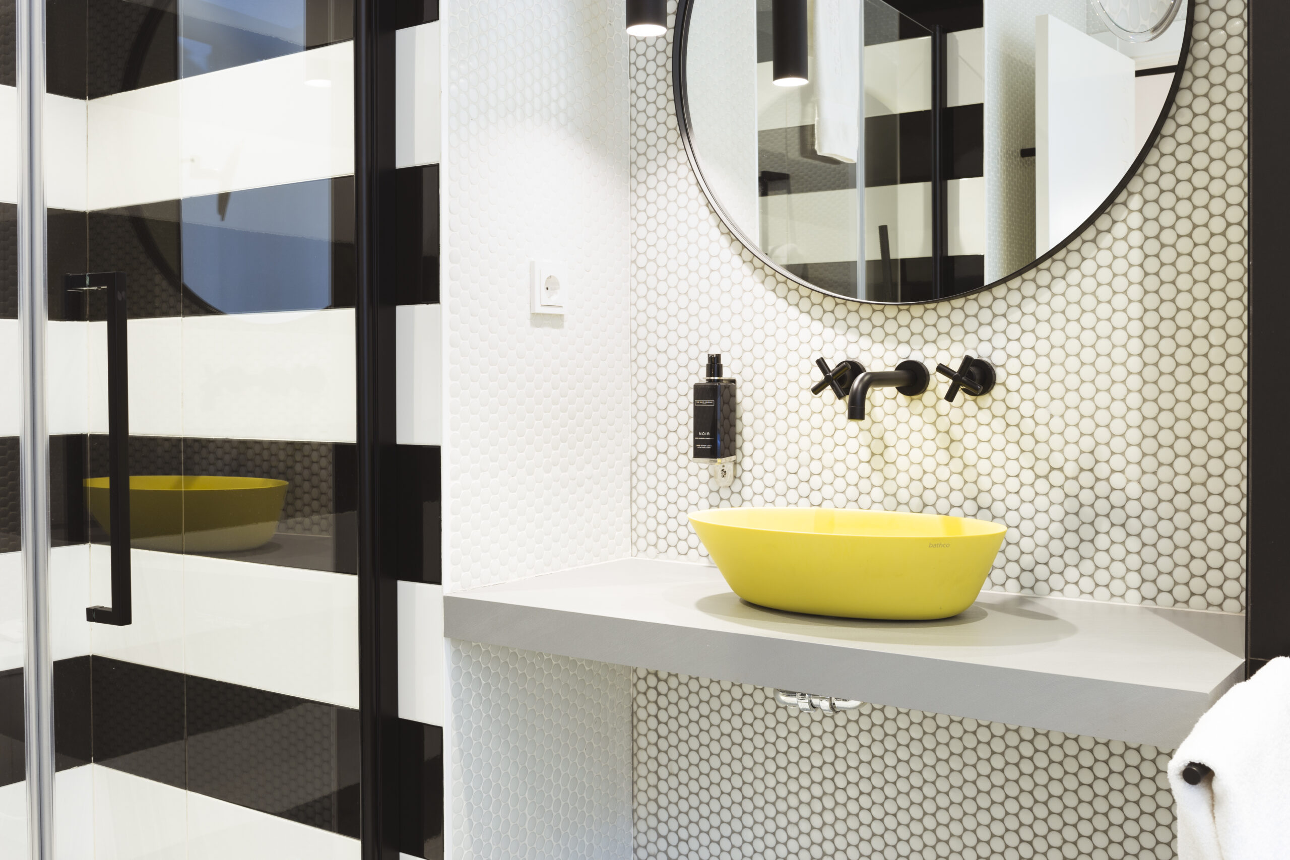 En el baño de la habitación 209 Skyline se coloca el lavabo Trieste amarillo de Solid Surface destacando sobre el Black and White que se logra con azulejos y mosaicos de Hisbalit.
