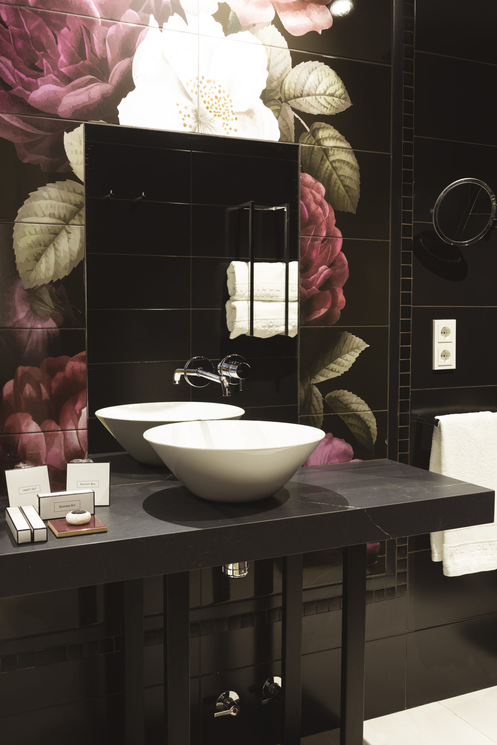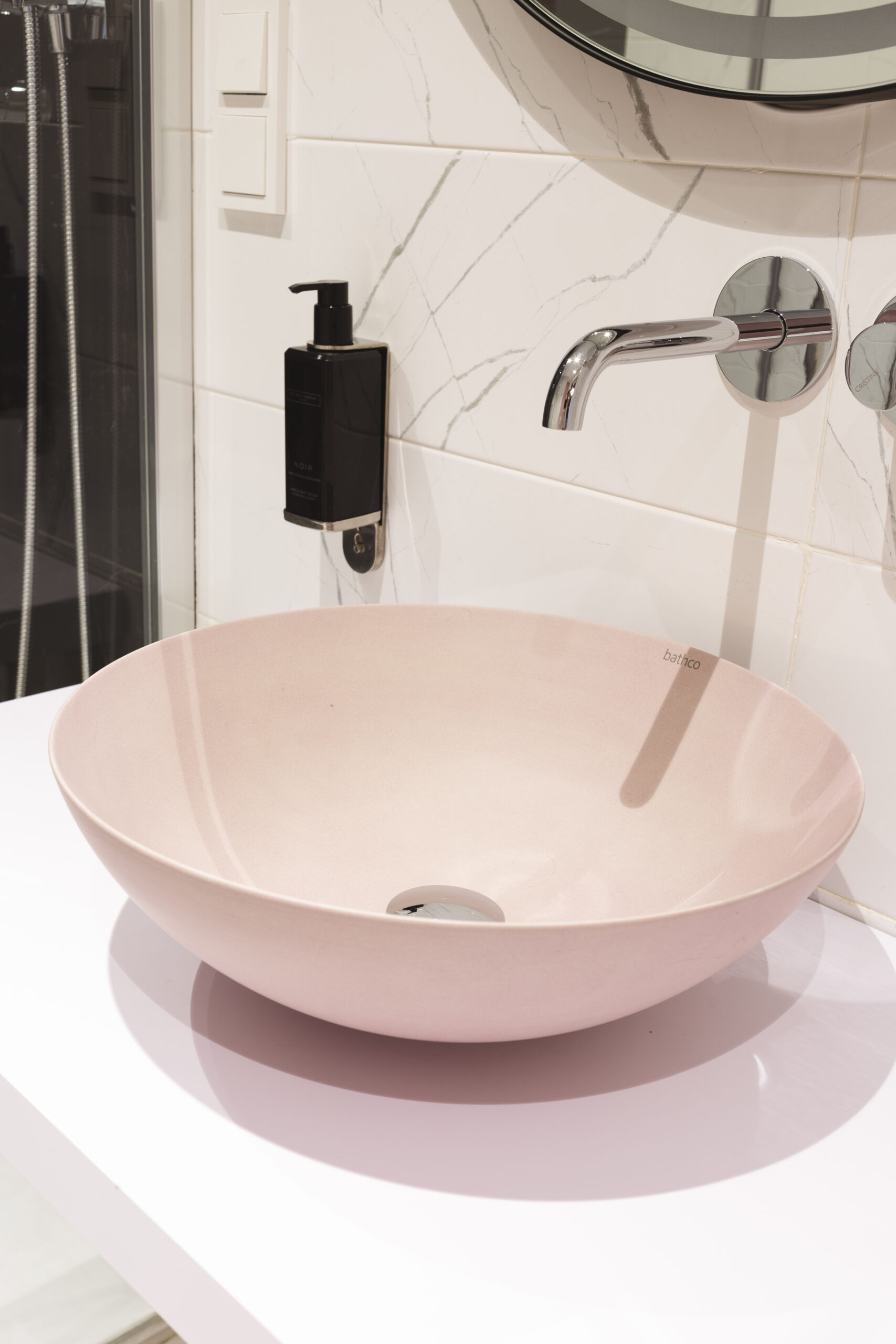 Para el baño de la habitación 211 Peony bouquete la diseñadora quería que el lavabo tuviese un aspecto similar a los mosaicos de Hisbalit que se colocaron en una de las paredes. Para lograrlo, los artistas hicieron diferentes pruebas hasta dar con el color exacto y obtuvieron un lavabo Lysa en tonos rosáceos. Aquí también se puede ver el juego de soportes con encimera blanca.