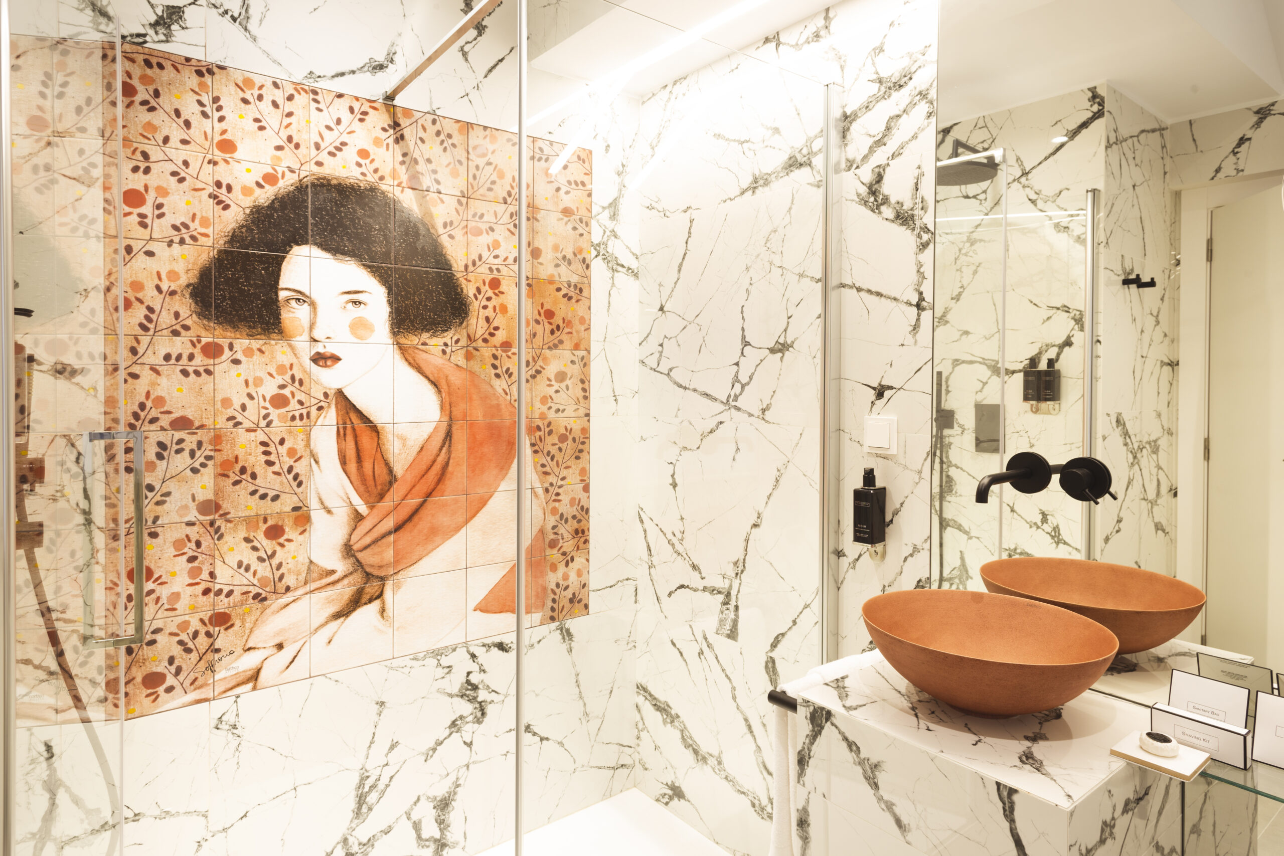 La habitación 306 Anastasia guarda uno de los murales realizados por los artistas de Bathco Atelier basado en la ilustración “Anastasia” de Sofia Bonati y se escogieron los tonos principales para crear el lavabo de porcelana recubierto en microcemento teja creado también en el taller de la compañía.