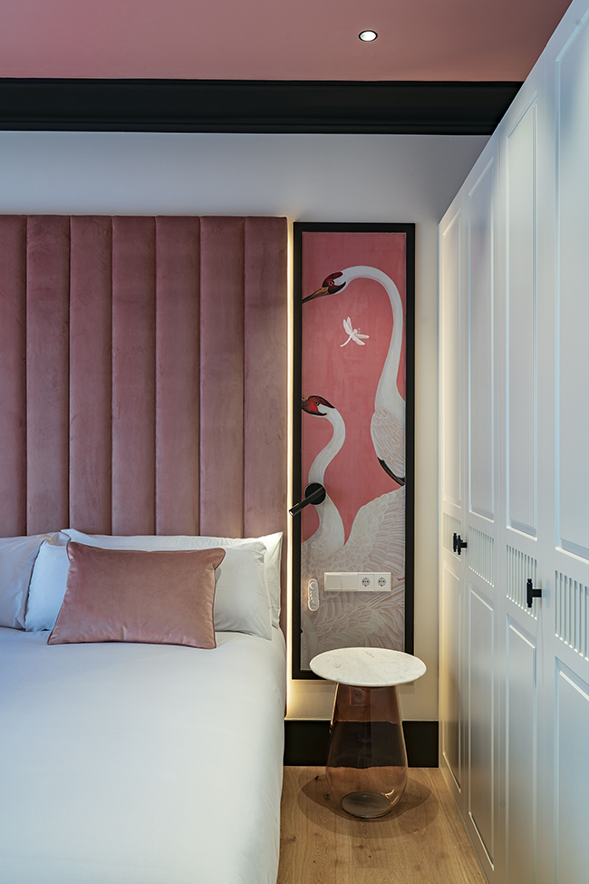 El baño en suite del dormitorio principal es una obra de arte en sí mismo, con toques de rosa y blanco. Al igual que la habitación, que reflejan la esencia moderna y sofisticada de la residencia. El inodoro negro de Bathco añaden un toque de elegancia, mientras que el lavabo diseñado por el Atelier de la misma marca, añade un toque de luz y estilo. “El lavabo está inspirado en el remolino del cambio de Bilbao, de unos trazos negros significativos a la industria de Bilbao, a una explosión de arte, colores y luz. De un Bilbao de amplia oferta gastronómica y cultural».