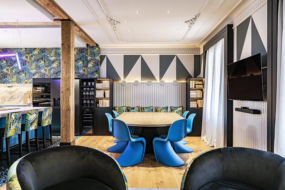 El diseño de la casa se inspira en la búsqueda de diversión y originalidad. Rompiendo con lo convencional y ofreciendo un espacio completamente diferente a lo habitual en Bilbao. El enfoque social se refleja en la distribución del espacio, con una amplia zona que integra la cocina, el comedor y el salón en un ambiente vibrante y lleno de color.