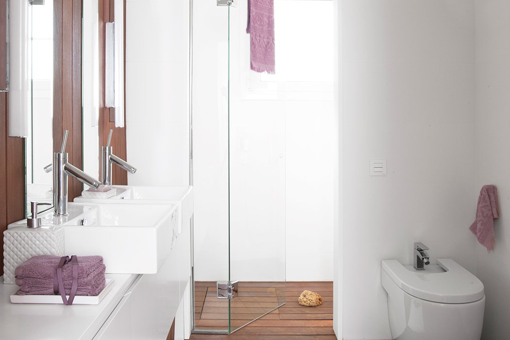 El lavabo Tenerife de Bathco da continuidad al predominio del blanco en el baño.