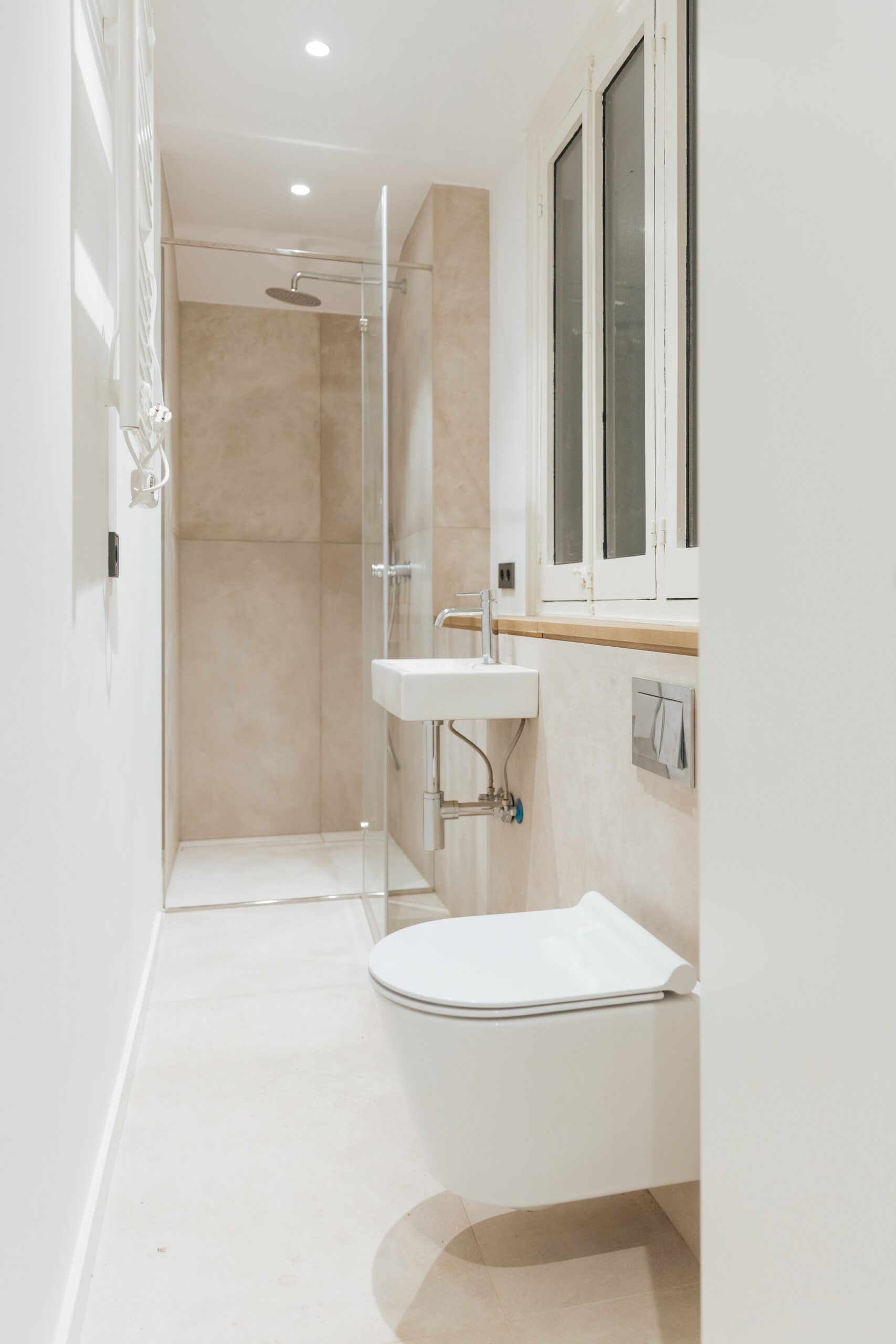 Otro de los baños es un espacio alargado y estrecho, por ello se decide instalar sanitarios suspendidos que permitan una visión más ligera, por ello se coloca el lavabo París suspendido.