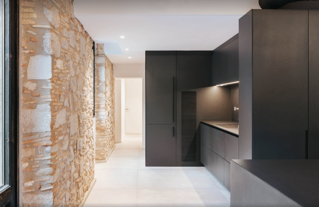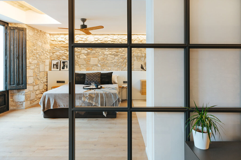 Combinando pasado y presente, la intervención incorpora un sobrio juego de materiales que coexiste con la historia de la vivienda. Se restaura cuidadosamente para recuperar materiales y elementos originales, como por ejemplo las paredes de piedra, la vuelta, las aperturas originales de madera…