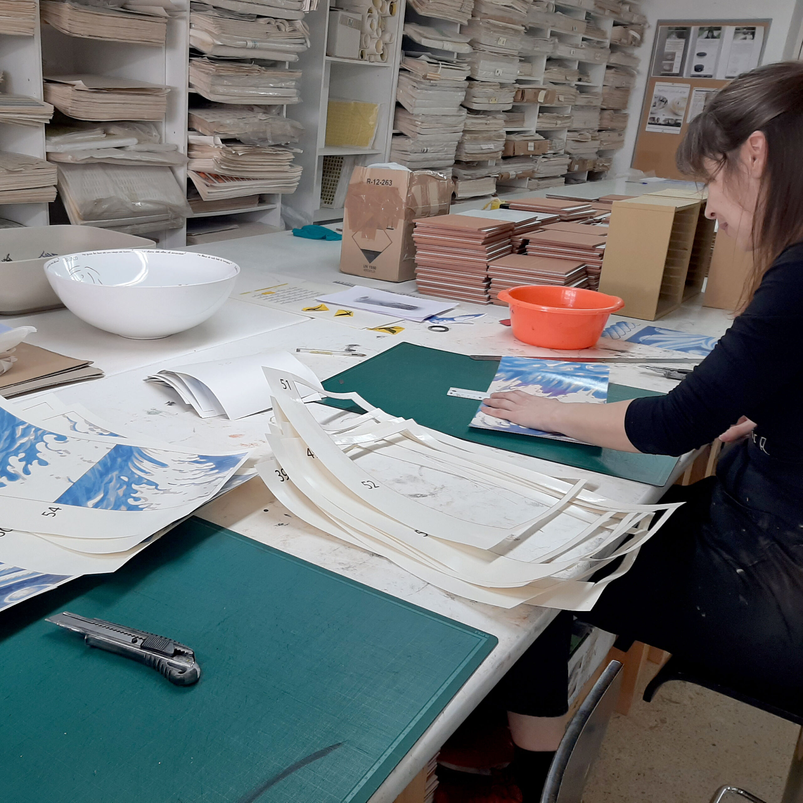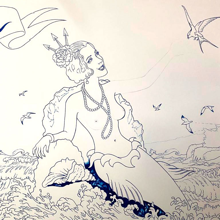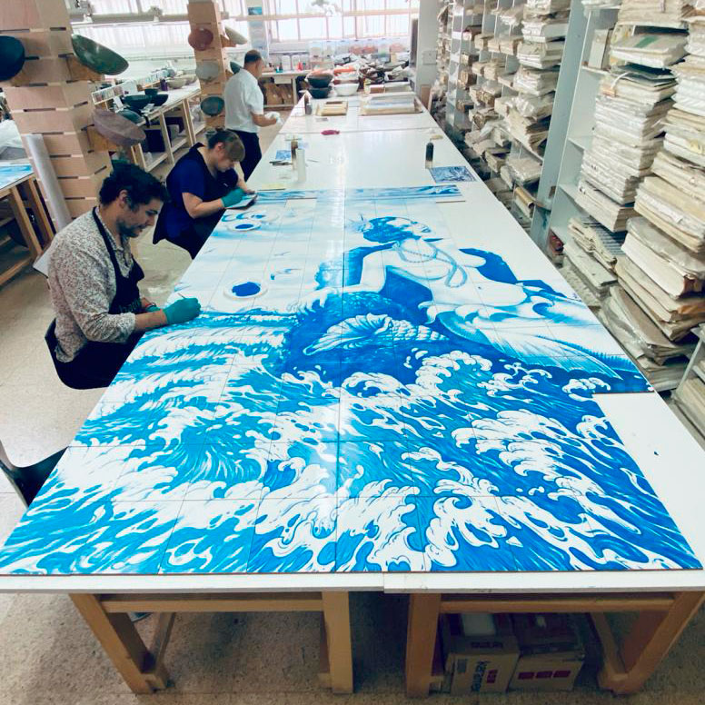 Fueron los artistas de Bathco Atelier quienes reprodujeron esa ilustración a escala para lograr un gran mural de casi 7 metros de largo formado por azulejos de 20×20 cm. El proceso comenzó con la digitalización parapoder adaptar el dibujo a los azulejos como si de un puzle se tratase. Tras esto, se imprimieron las calcas cerámicas que se colocaron sobre la porcelana de forma artesanal gracias a las manos expertas denuestro taller. Para reavivar el azul añil tan típico de la porcelana portuguesa, los artistas enriquecieron el mural pintándolo a mano alzada y dando vida a esa mujer que se ha convertido en heroína.