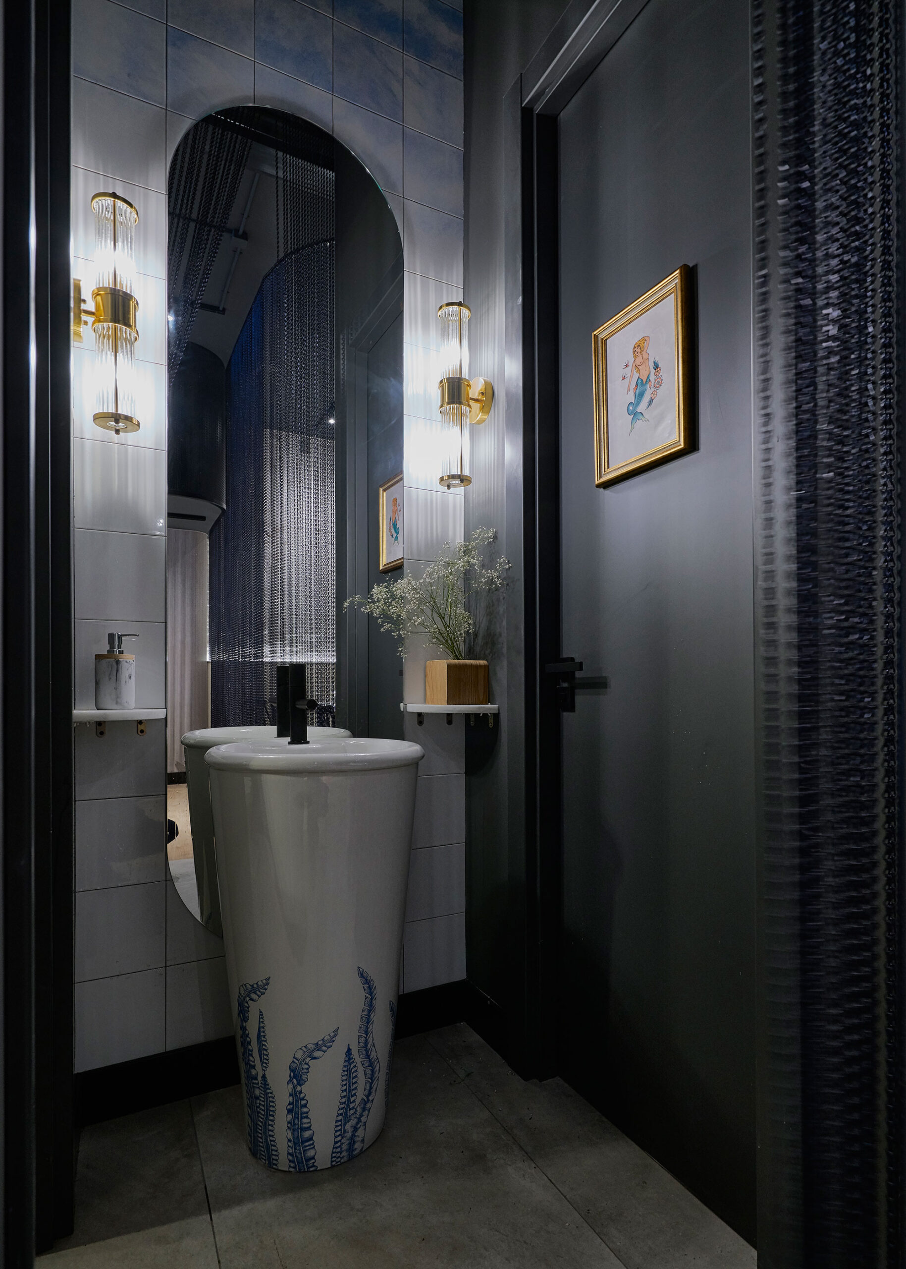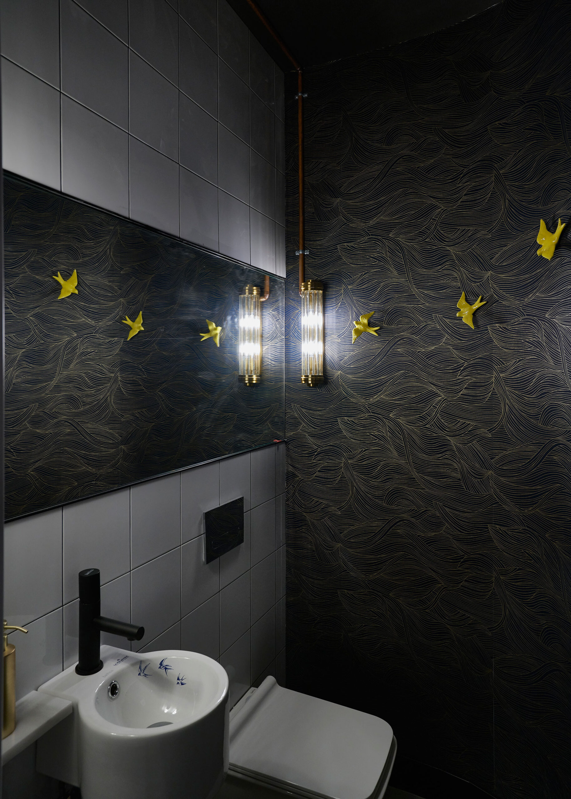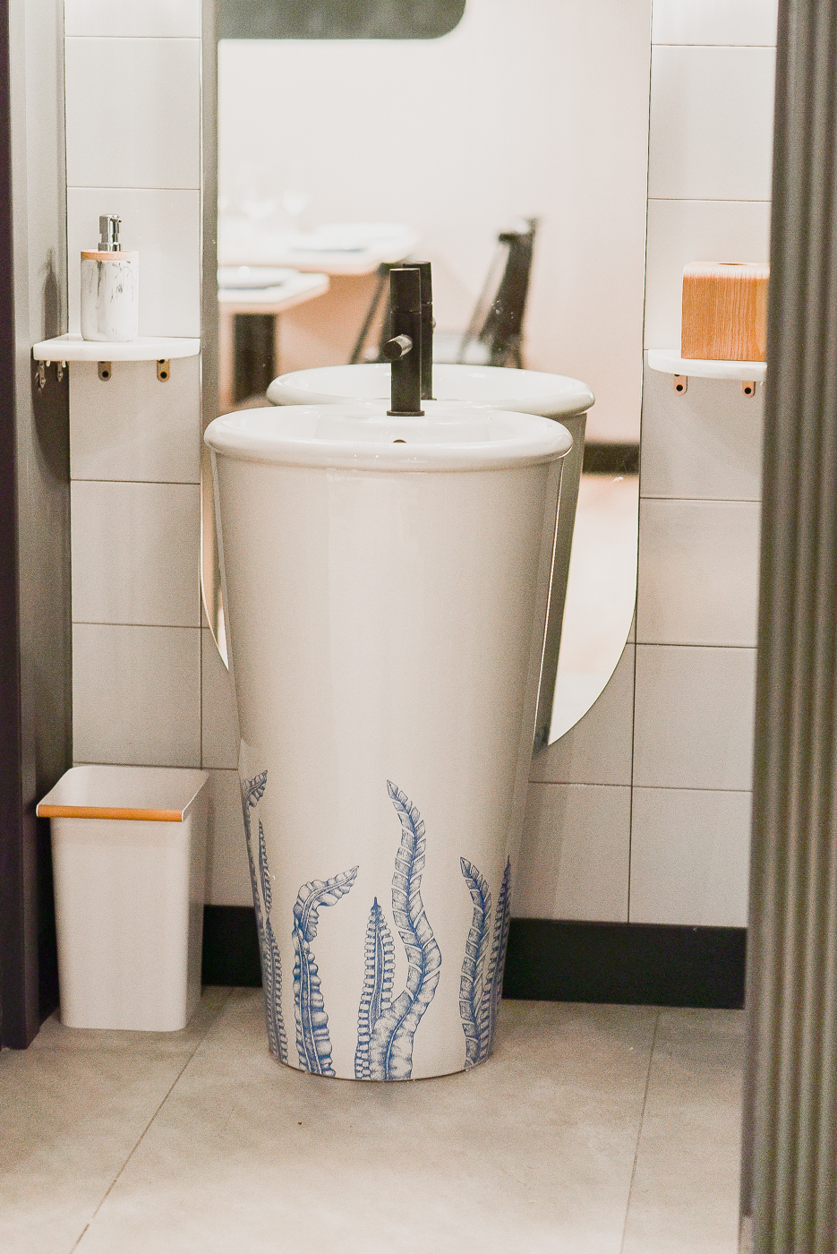 Lavabos Roma y Jerez de porcelana intervenidos por los artistas de Bathco Atelier. Inodoro suspendido Piamonte. Grifería negro mate Iconos.