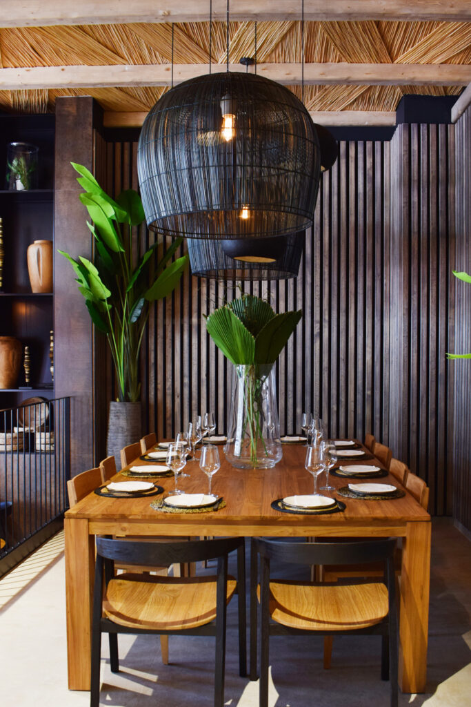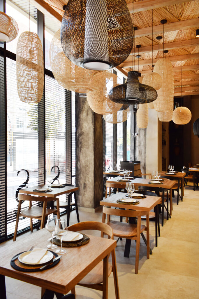 El proyecto de interiorismo se inspira en los productos naturales que son la esencia de la cocina de Presseguer. La madera y la cerámica, con sus texturas orgánicas, toman el protagonismo, proporcionando una atmósfera acogedora que invita a los comensales a sumergirse en un entorno sensorial único. La iluminación cálida se integra de manera armónica con una paleta de colores que abraza tonos tierra, mientras que el verde de la vegetación y el malva de la flor de melocotonero añaden frescura y vitalidad al espacio.
