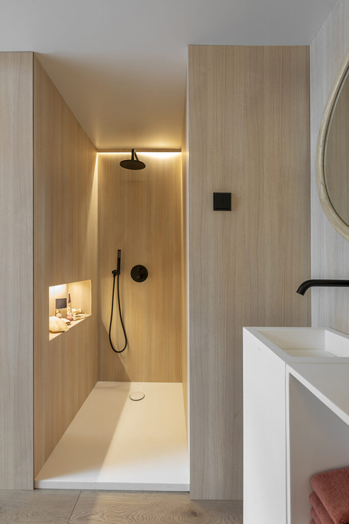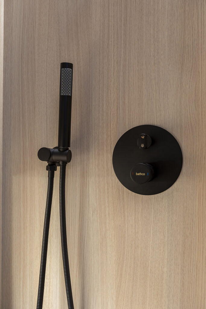 El segundo módulo alberga un baño completamente equipado, diseñado para maximizar la funcionalidad sin sacrificar el estilo. Con una ducha, lavabo Cuadrado de Solid Surface y grifería de Bathco, cada detalle ha sido cuidadosamente seleccionado para garantizar una experiencia de lujo y comodidad.