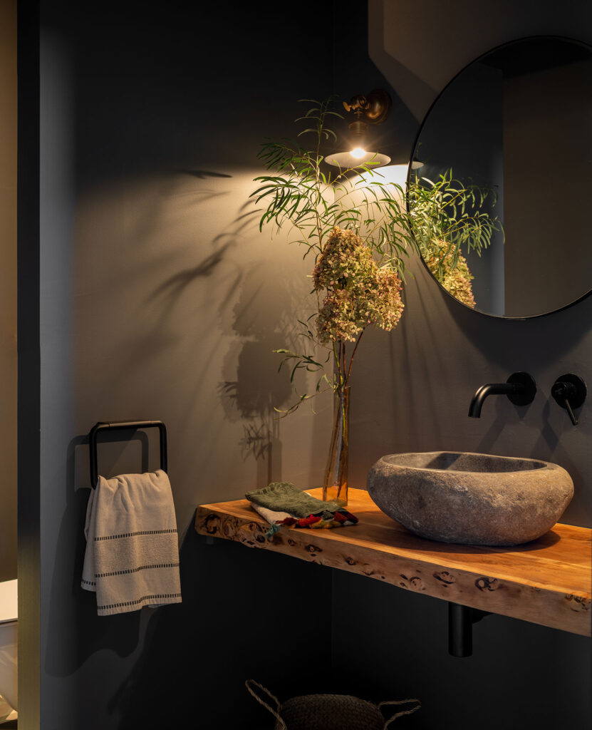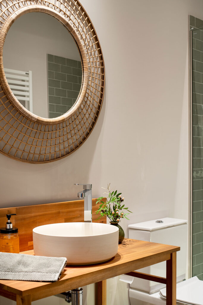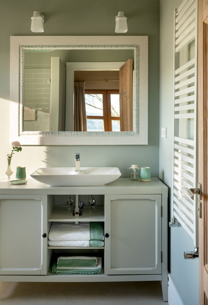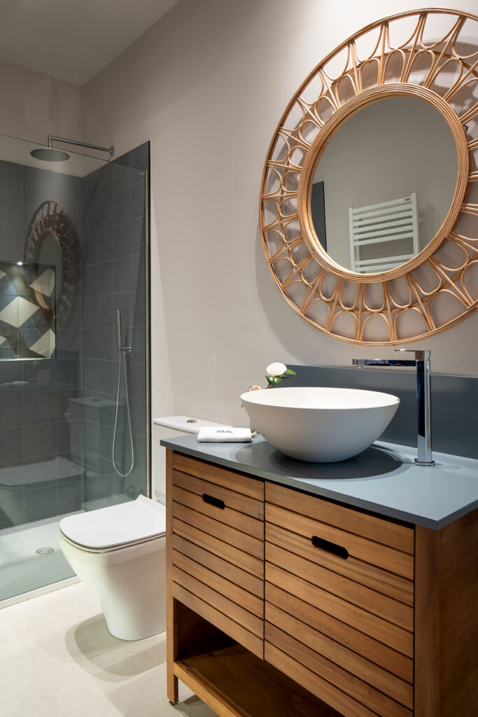 El baño de invitados aparece con las paredes en gris oscuro y una iluminación útil y agradable. Ahí se instaló la encimera de madera de acacia para soportar el lavabo Río. En el resto de baños también se pueden encontrar lavabos de la marca Bathco. Los modelos de porcelana Carnac, New Cuenca y Brujas se colocan sobre muebles diferentes que dotan de personalidad propia a cada espacio.