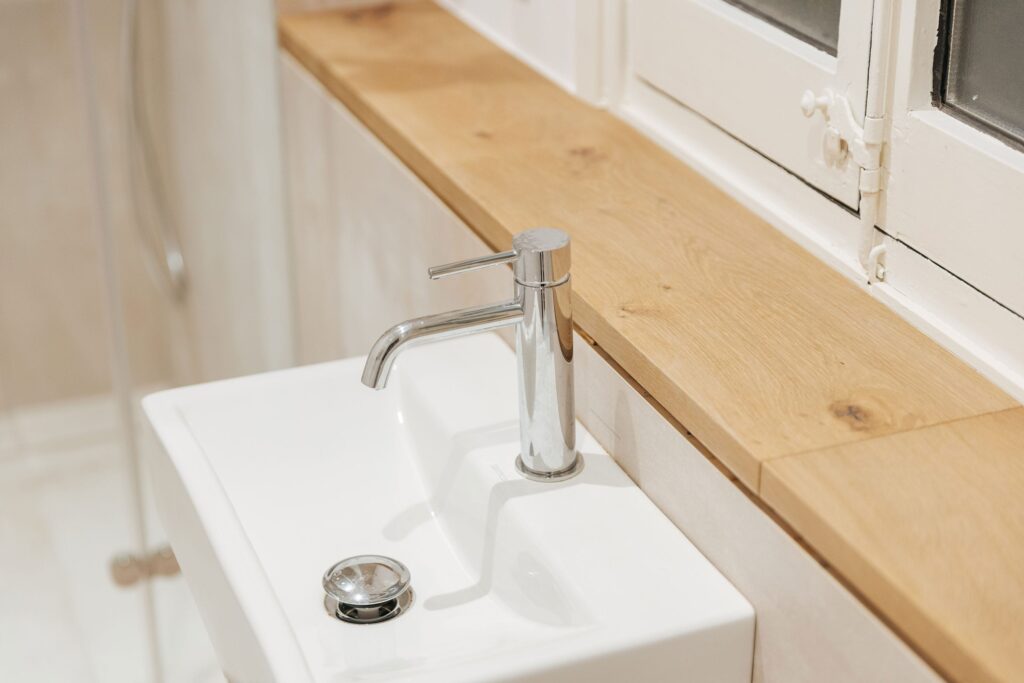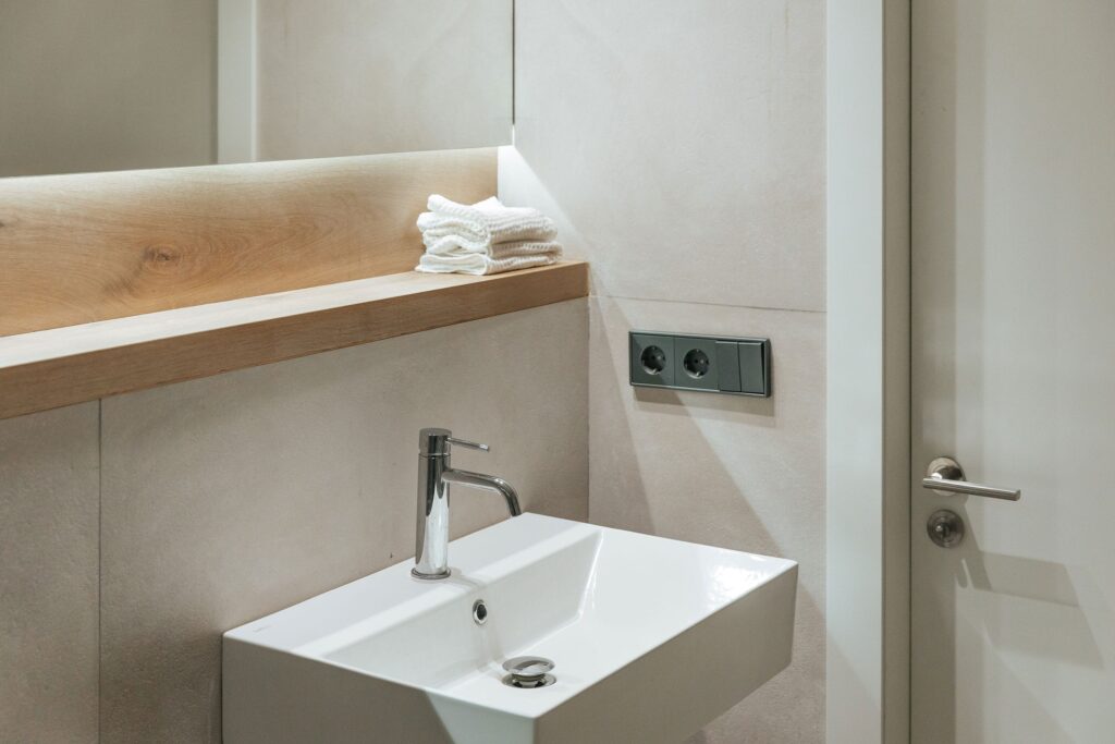 Otro de los baños es un espacio alargado y estrecho, por ello se decide instalar sanitarios suspendidos que permitan una visión más ligera, por ello se coloca el lavabo París suspendido.