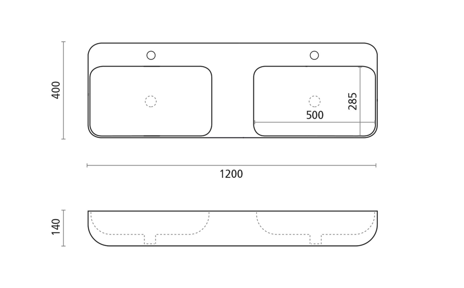 Un lavabo rectangular en solid surface con doble poza, pensado para instalación sobre encimera. Combina resistencia, pureza de líneas y una estética contemporánea ideal para proyectos contract.