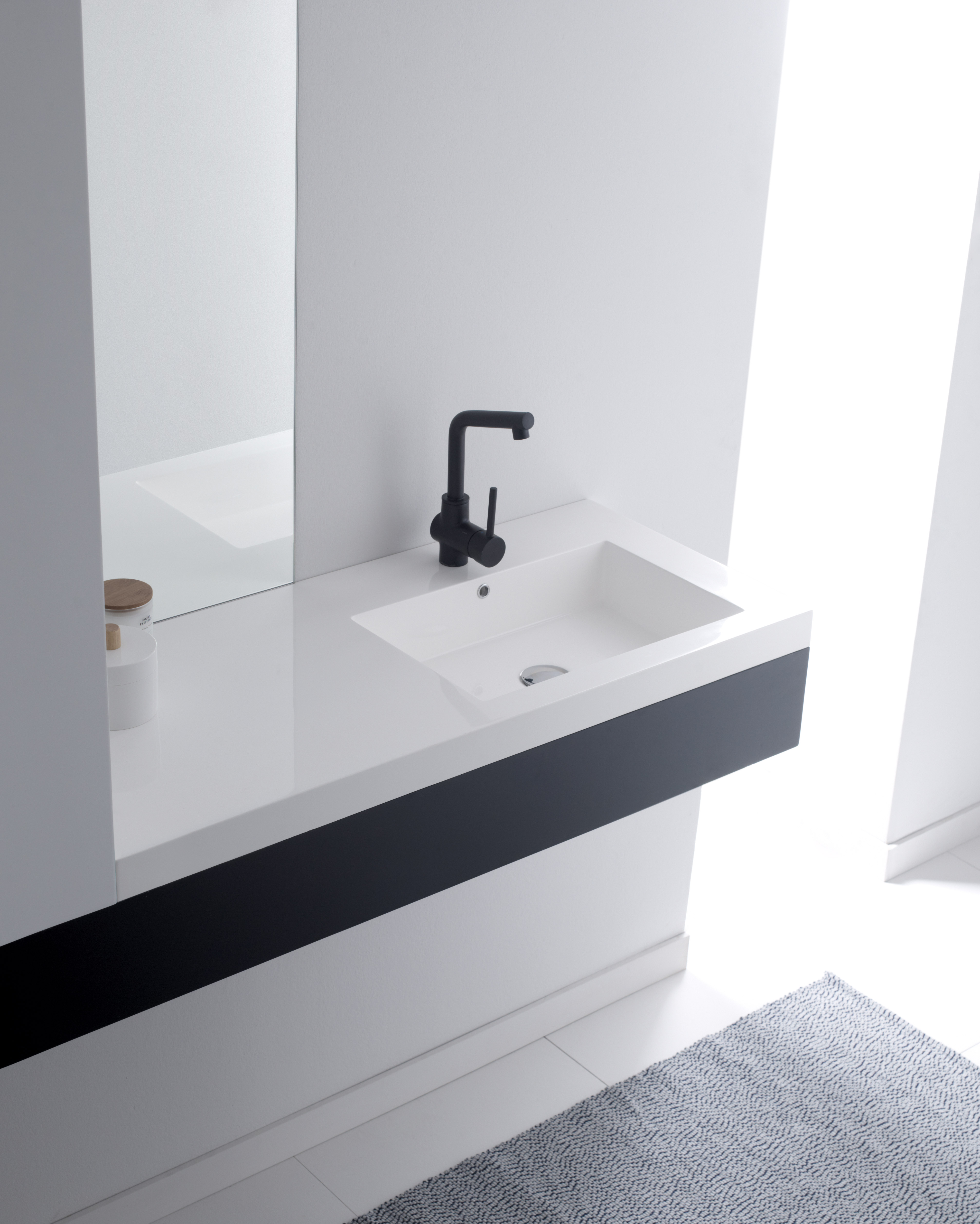 Encimera de resina de líneas rectas para instalar sobre mueble. Una pieza resistente y depurada que prioriza la funcionalidad sin renunciar al diseño.