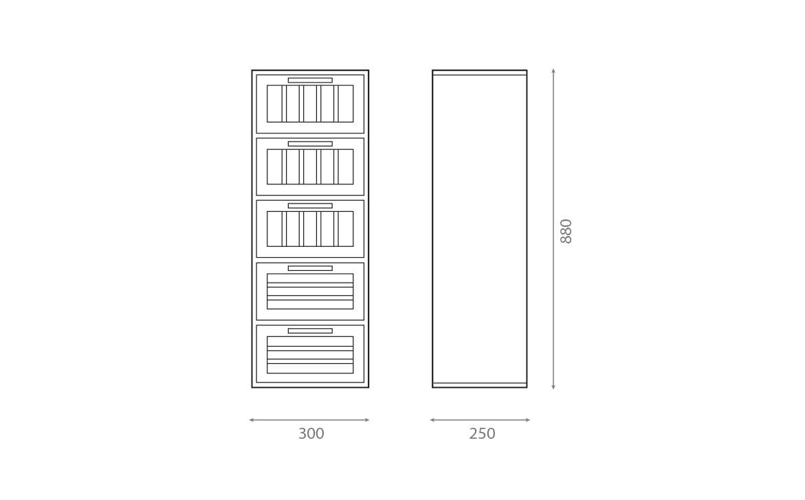 Estructura en madera de cerezo con cinco cajones abiertos. Un diseño auxiliar que aporta orden y calidez al baño.