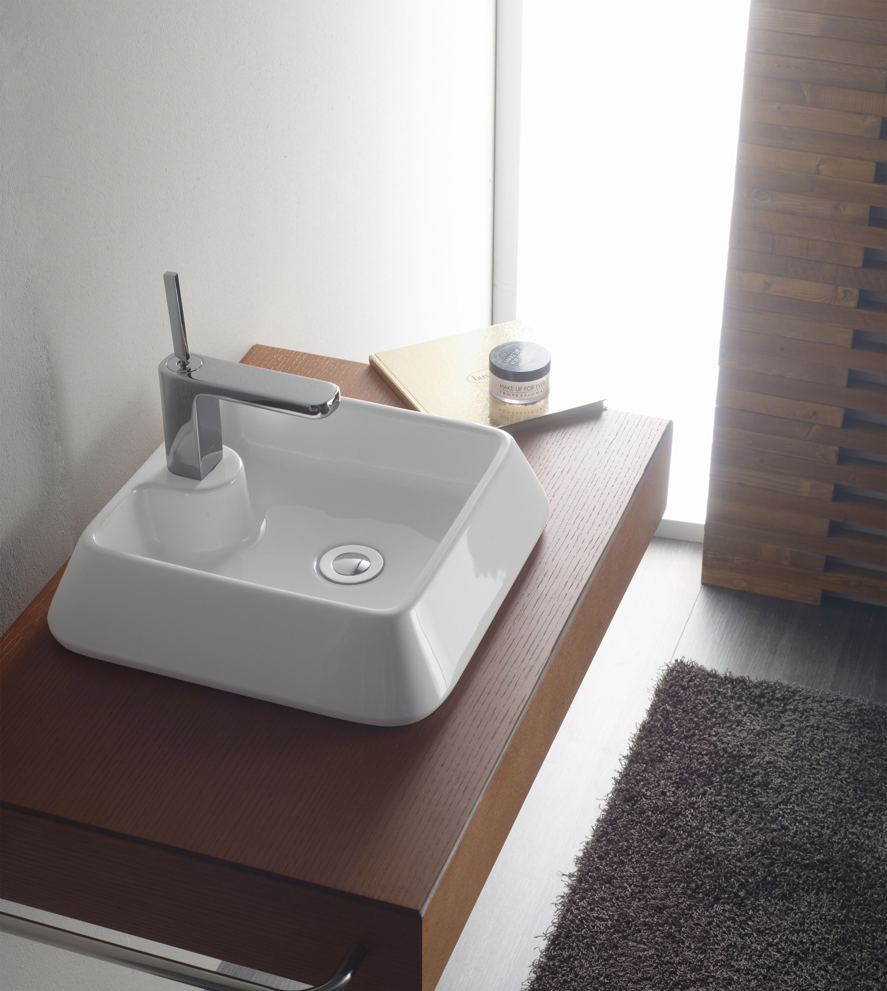 Formato cuadrado o rectangular en porcelana brillo. Diseños de sobre encimera, sin rebosadero, que se integran con encimeras Bathco para una solución completa.