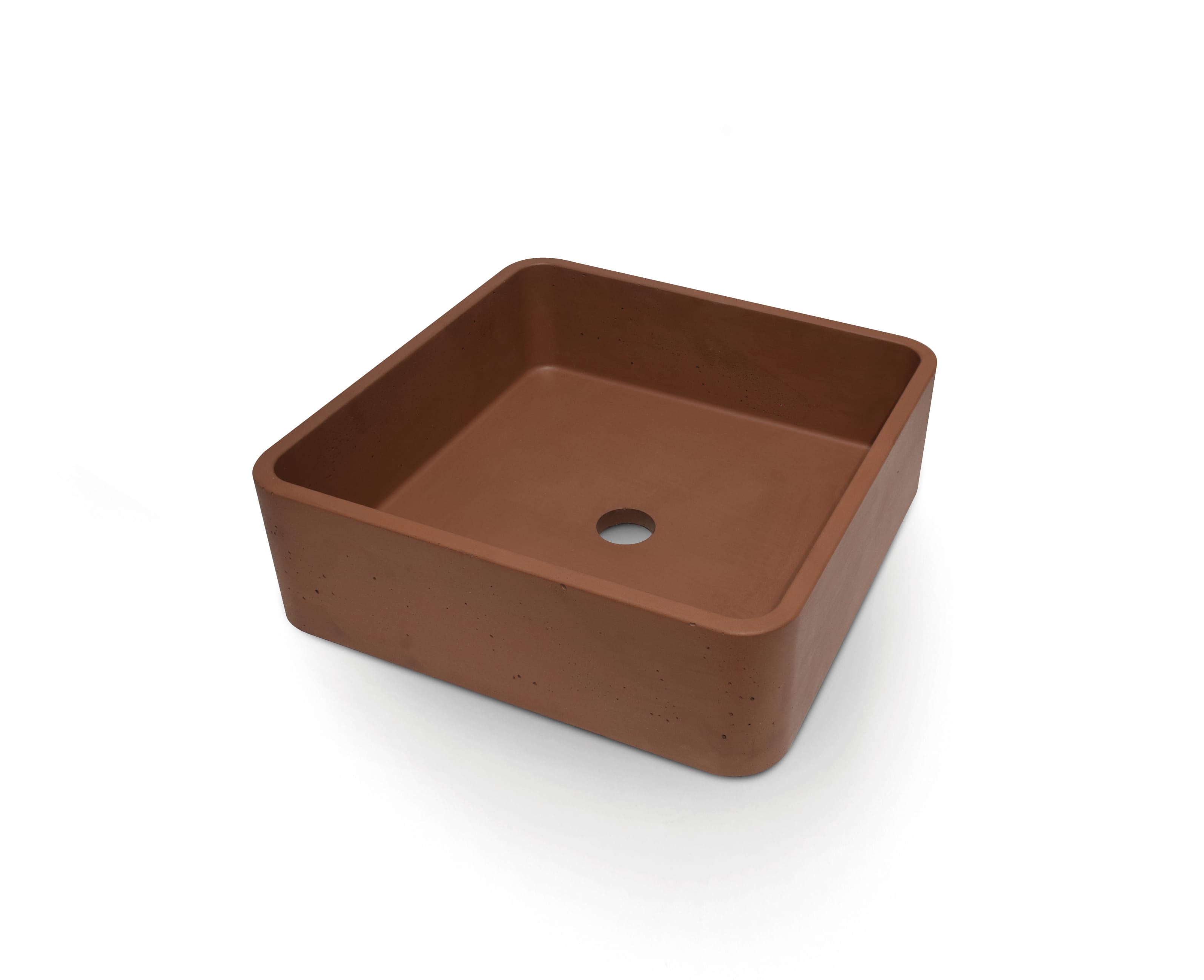 Lavabo cuadrado en cemento pigmentado. Disponible en gris claro, gris oscuro o teja. De instalación sobre encimera, aporta textura y un carácter industrial.